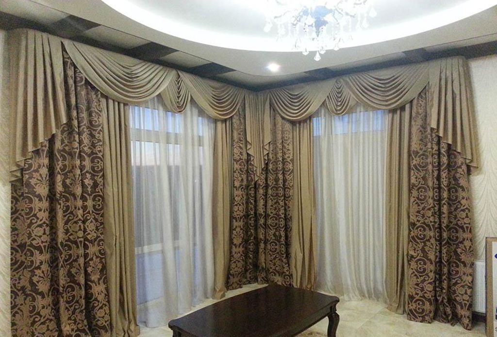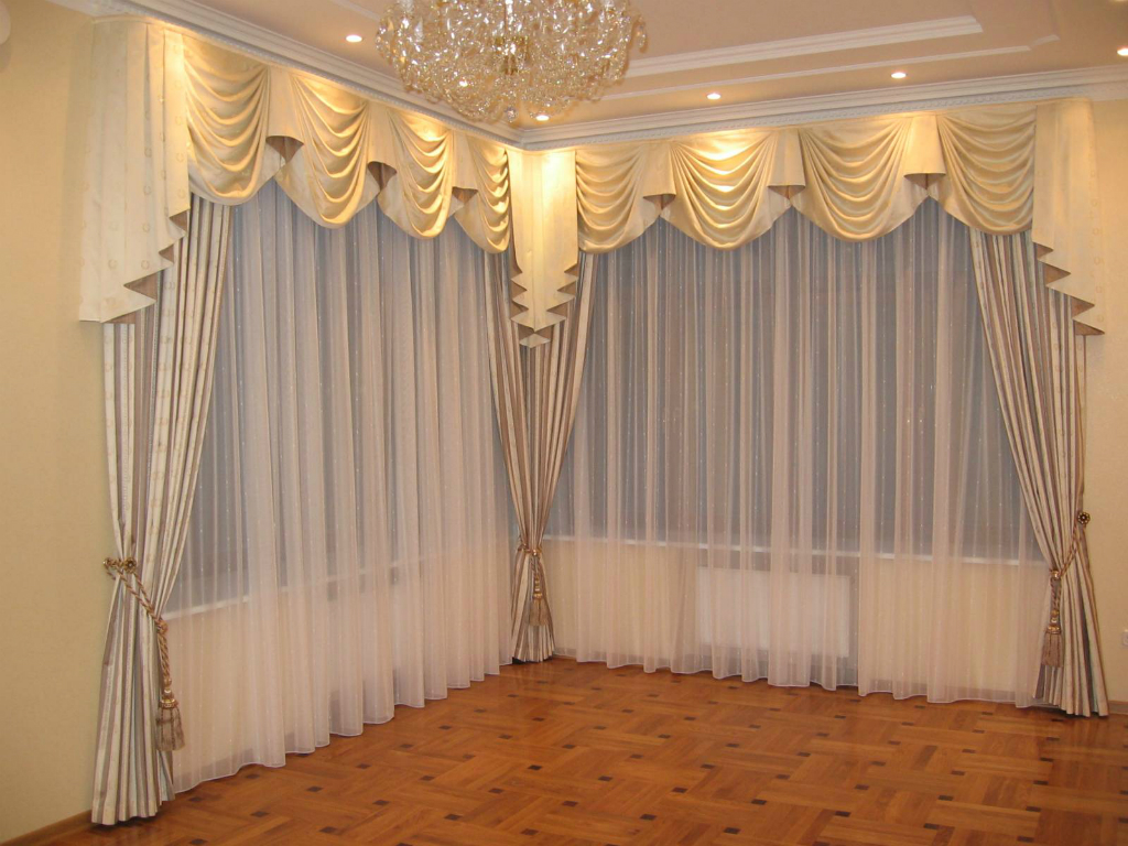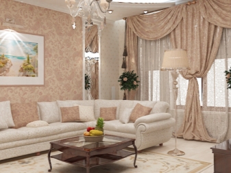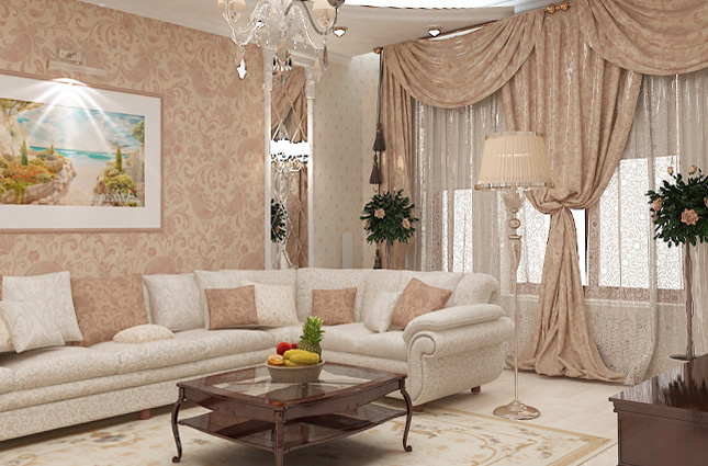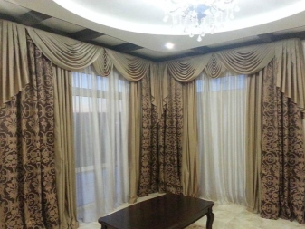 Une variante commune de la conception de salon - rideaux avec lambrequin. Il ferme la partie de l'avant-toit sur laquelle les rideaux sont fixés et la composition prend un aspect décoratif et complet. Cependant, il est important de garder à l'esprit que le bandeau n'est pas conçu pour les pièces avec un plafond bas, car il réduit visuellement leur hauteur.