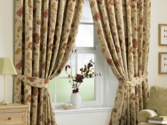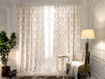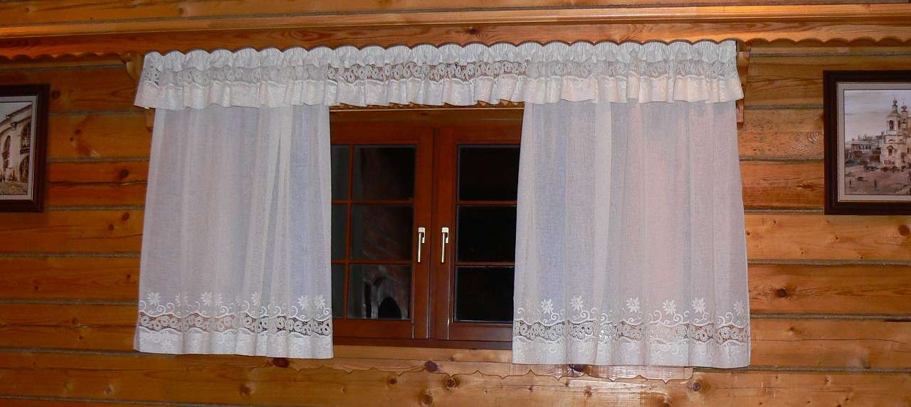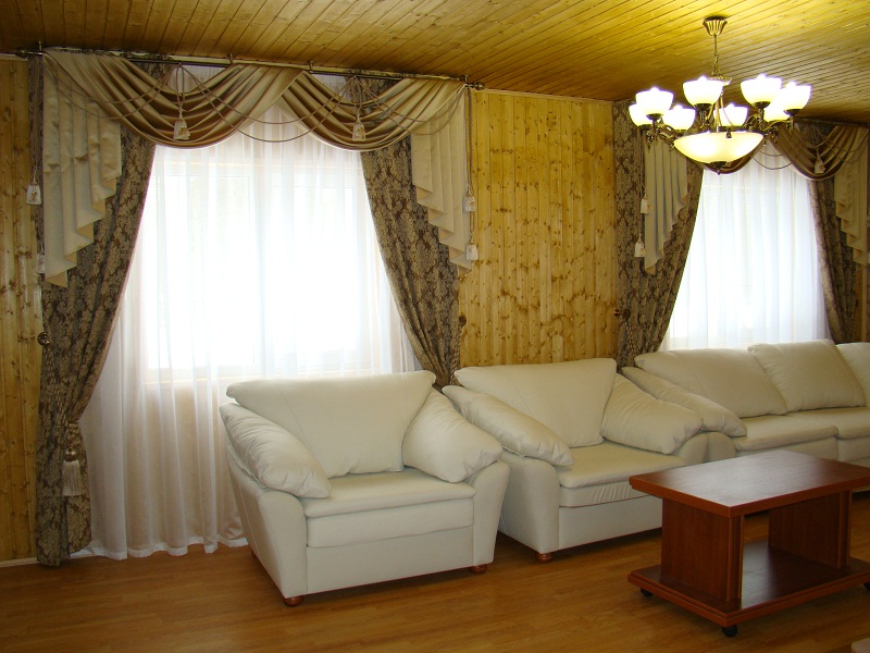 Dans les intérieurs en bois classiques (style ethnique russe, directions écologiques), des rideaux en tissus naturels associent des tissus denses et légers.types classiques de rideaux. Une variété de draperies sur le ruban de rideau et un jeu de couleurs vous aideront à ajouter du zeste.