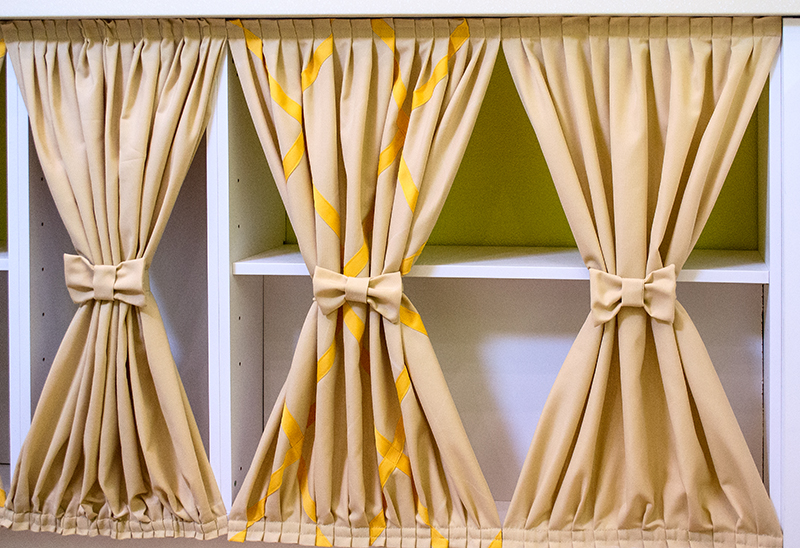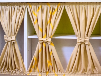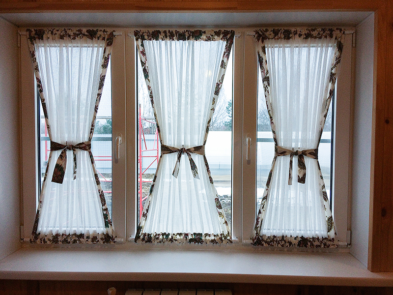 Une particularité des rideaux est qu’ils sont conçus pour les fenêtres étroites et hautes et qu’ils sont fixés au centre par des rubans, des arcs ou des lacets. Vous pouvez décorer le lieu de montage avec des éléments décoratifs.