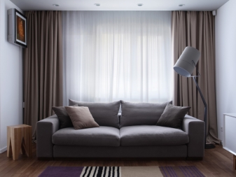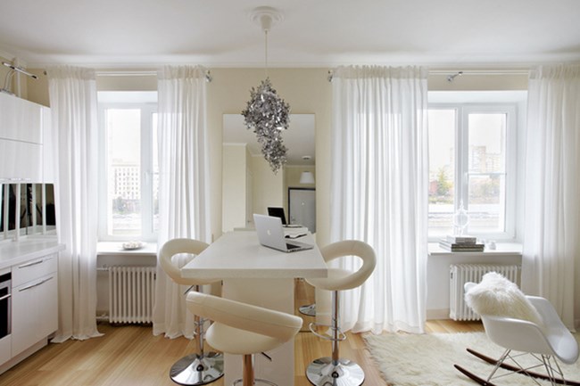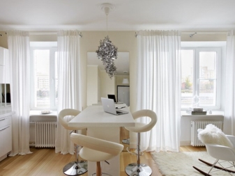 - Pour le studio Les styles modernes sont parfaits, dans lesquels le zonage libre de l’espace, la liberté et des éléments de créativité sont les bienvenus. Dans ce cas, la décoration des fenêtres est peut-être la plus inattendue, mais la priorité est donnée aux tissus clairs et translucides, qui laissent passer la lumière naturelle, ce qui est nécessaire pour la transparence visuelle et l’agrandissement visuel d’une petite zone.