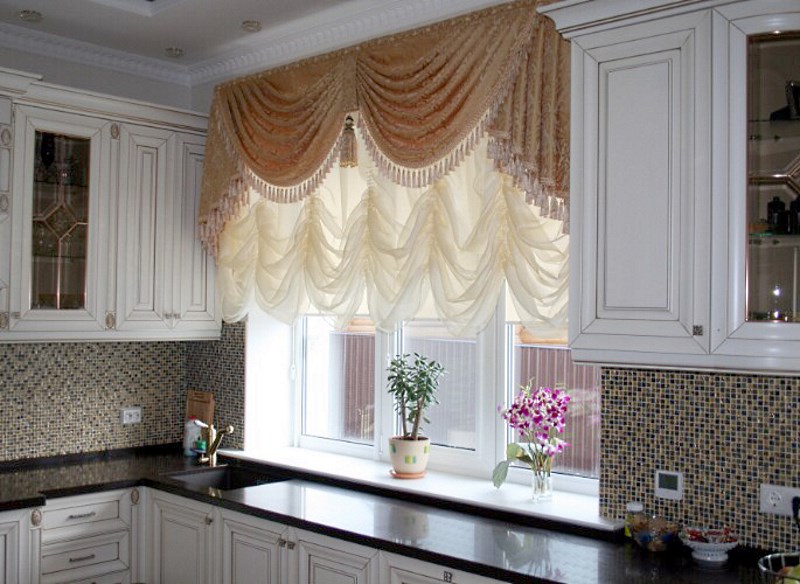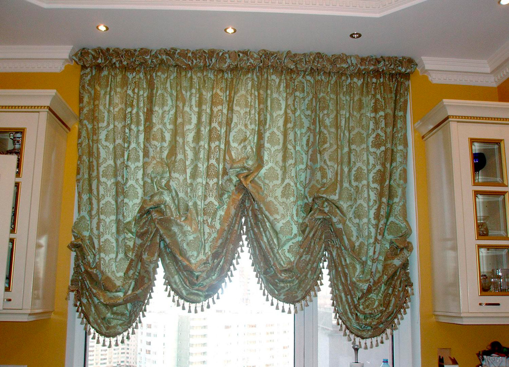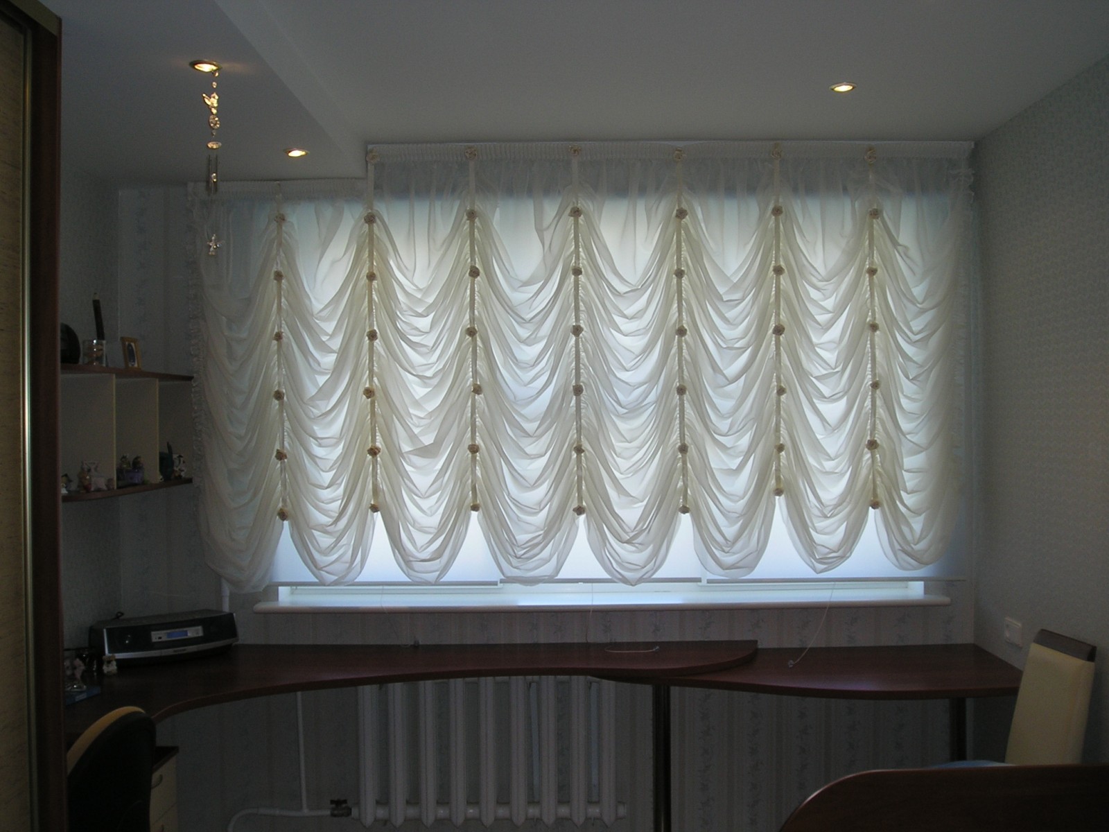 Le deuxième nom par lequel ils sont connus est feston. Ils représentent une toile assemblée en plis horizontaux à l’aide de dentelles ou de rubans spéciaux.Ils passent le long du côté couture du tissu à travers plusieurs rangées de boucles ou de bagues. Si les cordons sont desserrés, le rideau est bien droit, il ne reste que des plis souples des houppettes sur le bord inférieur. Les rideaux ouverts se froncent en volants, donnant à la fenêtre un air de fête.