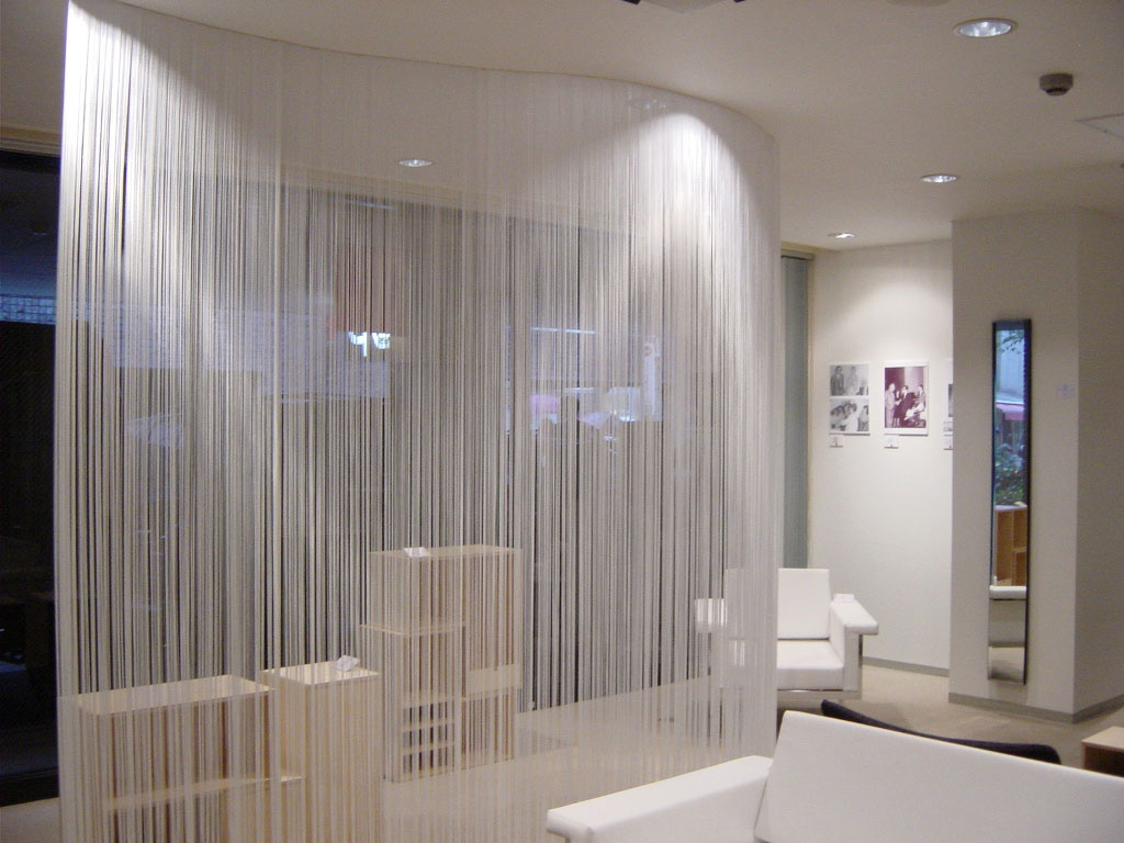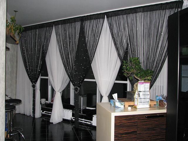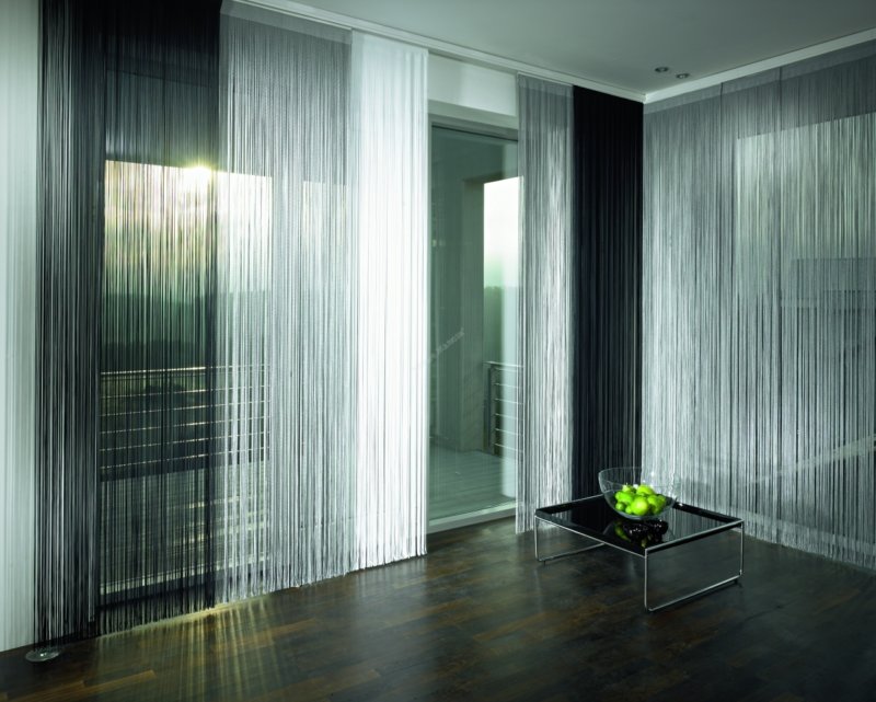 La toile de fils (mousseline, "pluie", perles et autres formes de plastique, bois ou textile) est fixée à la corniche et pend au sol. Ces rideaux confèrent à la pièce un aspect bohème et exotique, mais elle fonctionne parfaitement tout en la protégeant des regards indiscrets et en laissant suffisamment de lumière.Peut être utilisé à la fois sur les fenêtres et comme rideau entre les pièces d'une porte.