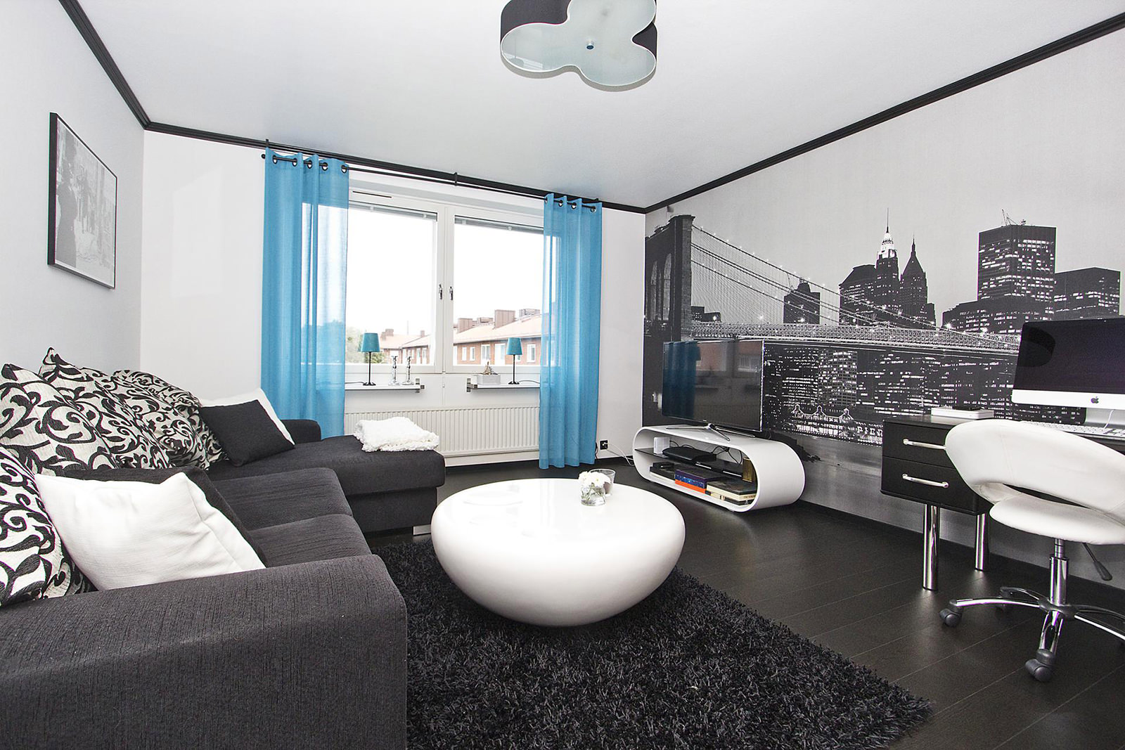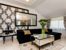 - Le gamma noir et blanc est une option gagnant-gagnant. C'est toujours élégant, à la mode et pertinent. Cet intérieur permet la présence d'accents lumineux.
