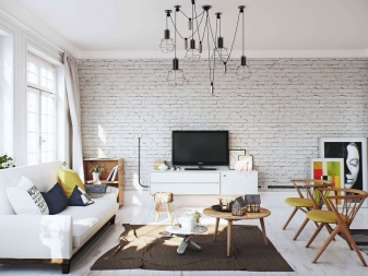 - Si le jeu n'est pas fait pour vous, une bonne option serait de vous concentrer sur les meubles marron foncé et les éléments de décoration lumineux (rideaux, coussins, etc.). La couleur graphite, café ou jaune accentue avec succès l'intérieur blanc.