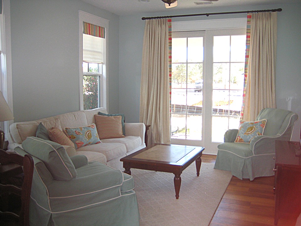 - Les tons pastel des rideaux et tout l’intérieur agrandissent visuellement l’espace.