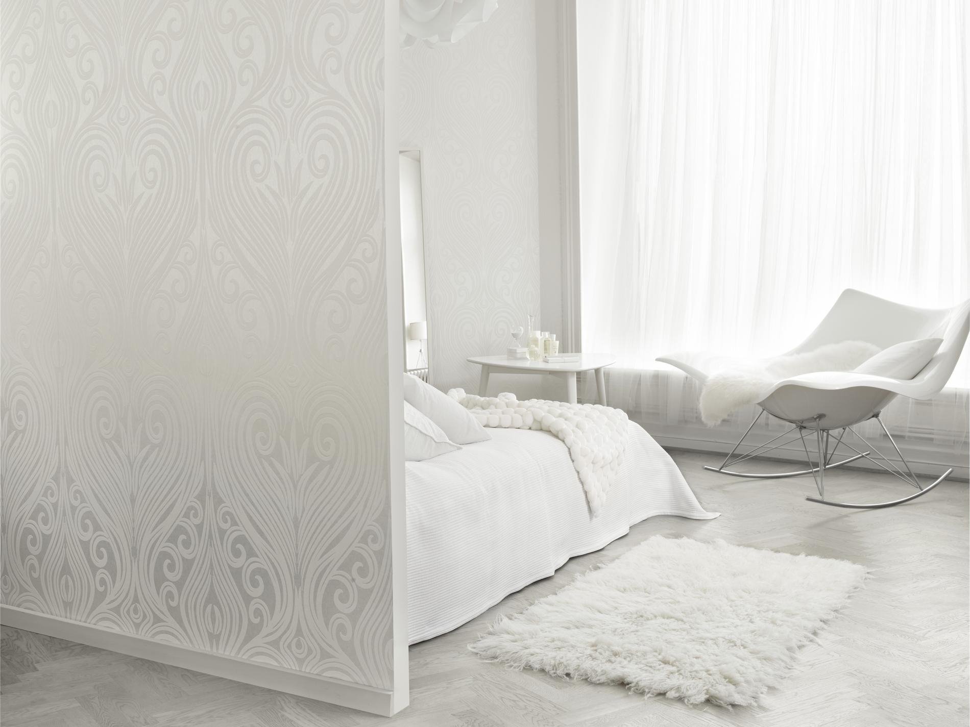 Le papier peint de couleur blanche laisse beaucoup de place à la fantaisie.Cette décoration murale permet l'utilisation de textiles aérés et épais. Les combinaisons les plus élégantes et les plus réussies avec une bordure blanche créent les nuances suivantes: