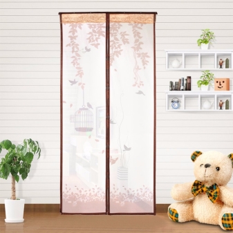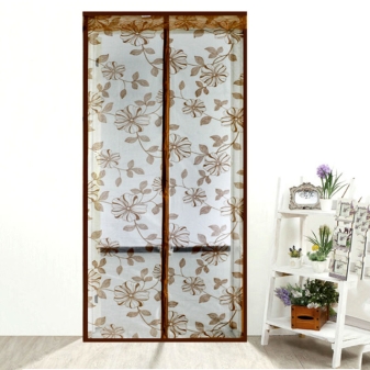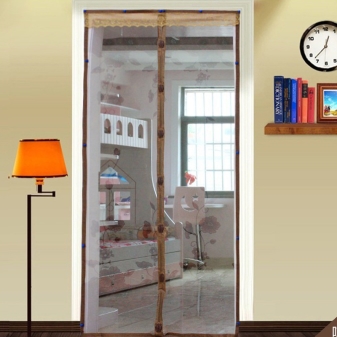 De tels rideaux dans leur conception sont très divers. Ils sont à la fois petits et grands, épais ou fins. La taille de la porte est généralement installé rideaux mesurant 210 cm de hauteur et 95 cm de largeur, accrocher sur les fenêtres d'une taille plus petite. Il existe également des portes moustiquaires - des structures qui s’ouvrent non seulement en bas, mais complètement.De tels produits sont plus denses et volumineux, ils se différencient également par leur prix. Les plus populaires sont les rideaux à double face, qui s'ouvrent et se claquent grâce à des aimants ou du ruban adhésif en pointe. Ces dispositifs sont installés sur des guides spéciaux, situés à l'extérieur de tels rideaux.