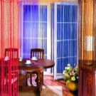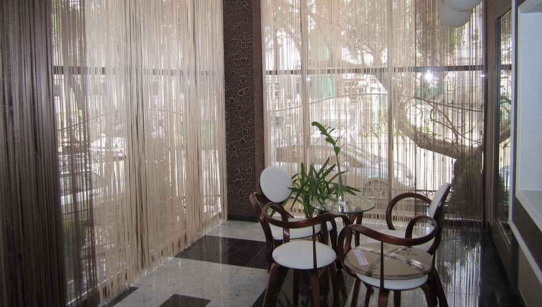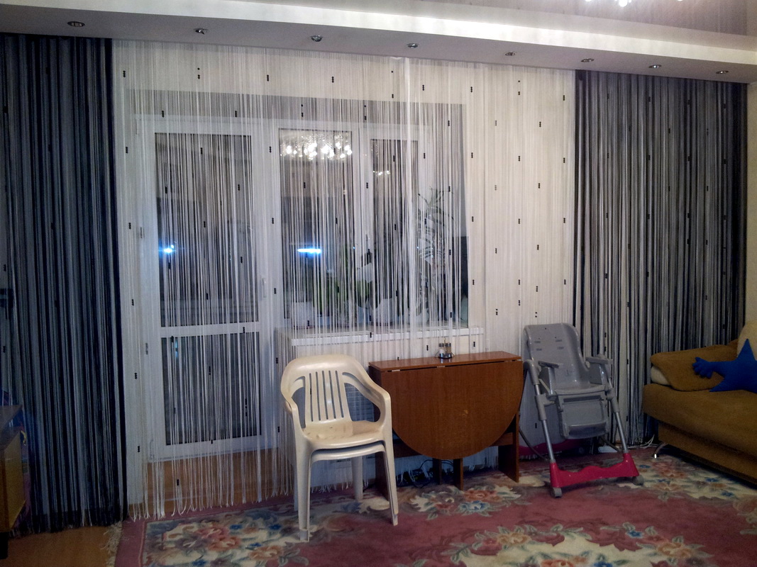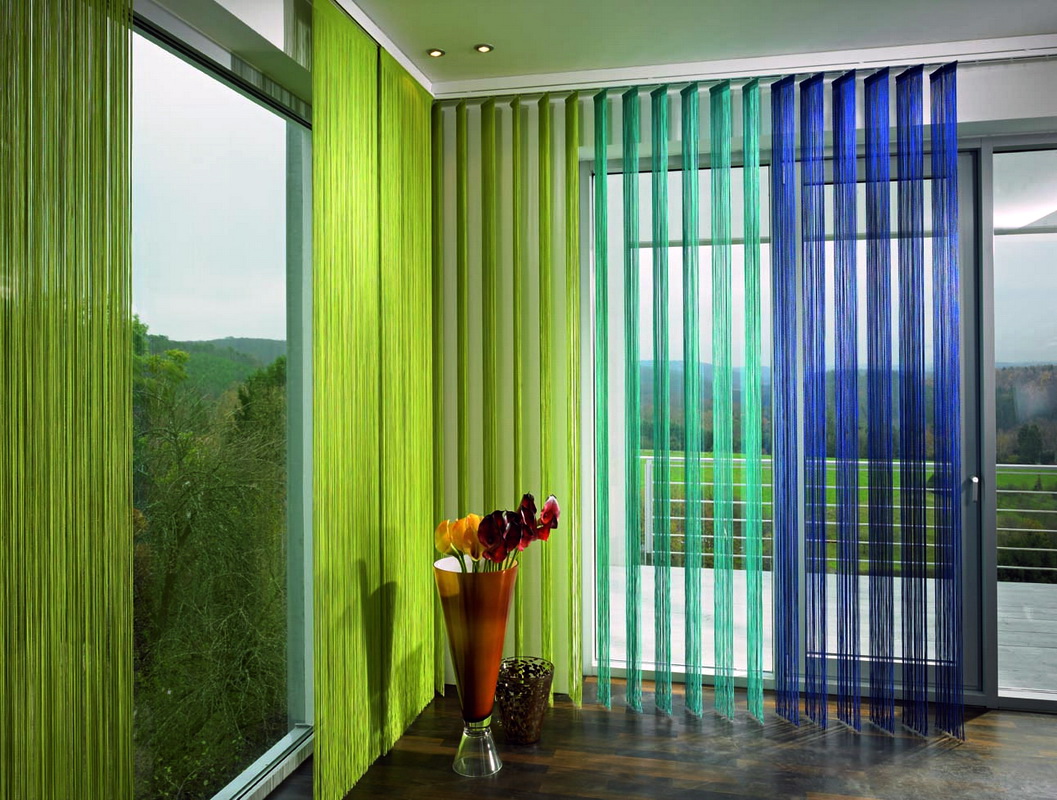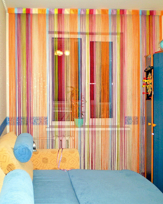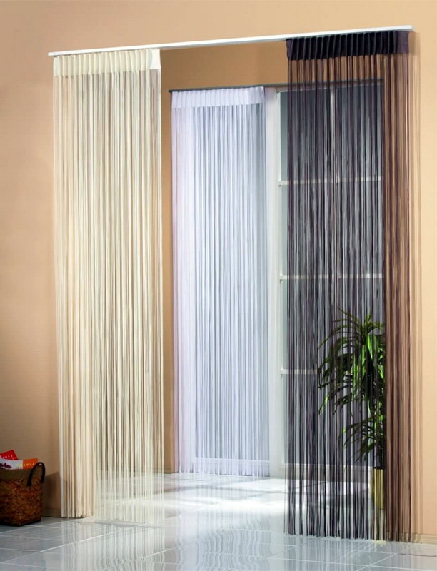 En plus de la couleur, il est important de réfléchir à la taille et à la fonction des rideaux avant de les acheter. Les fils peuvent avoir 2 types de longueur, alors que la largeur de la structure n'est pas limitée. Les cordes courtes peuvent atteindre le niveau du rebord de la fenêtre ou le couvrir légèrement.Les produits longs prennent de l'espace de l'avant-toit au sol même. Ils ne doivent en aucun cas reposer à plat sur le sol, sinon vous risqueriez de marcher sur le produit et de vous blesser. Selon la taille des harnais, leur quantité totale dans le produit varie également. Il y aura beaucoup moins d'épaisses spirales que de fines cordes, car le concept de base de ce type de rideau est leur légèreté, leur légèreté qui s'écoule dans chaque fil.