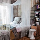 - Accrochez le rideau de zone contre le lit, formant une marquise dans une interprétation inhabituelle.