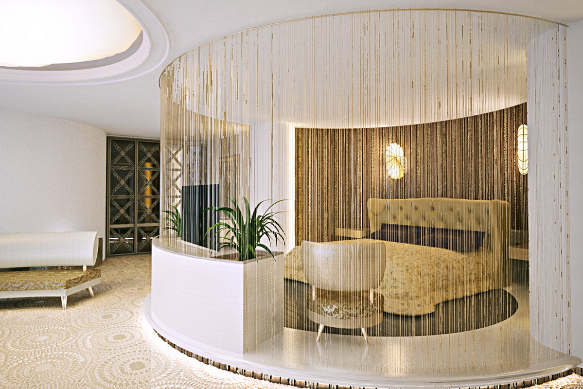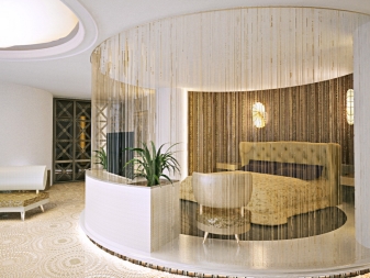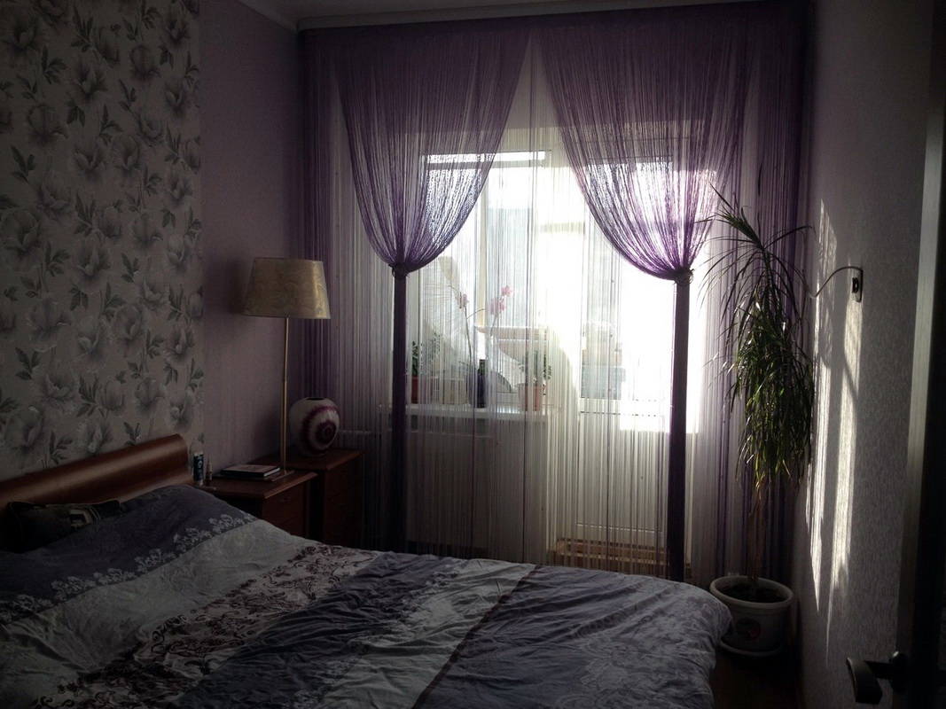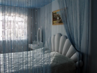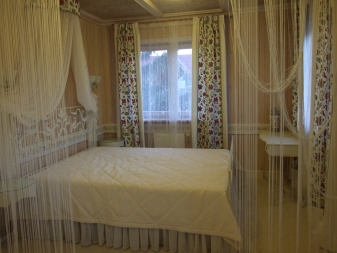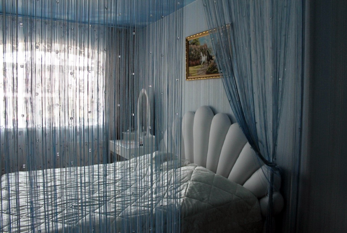 Dans la chambre à coucher, des produits similaires peuvent être vus sur les fenêtres, les portes ou en tant que délimiteur de zone. Même la conception du balcon des rideaux de coton n'est pas épargnée. Sur les loggias, de tels rideaux jouent un rôle décoratif, surtout en été. La chambre à coucher comprend souvent la séparation de l’aire de repos de la zone de travail. Pour une telle technique, les constructions de fils suspendus sont parfaites. Les textiles créeront une transition douce d'une zone à une autre tout en délimitant l'espace.
