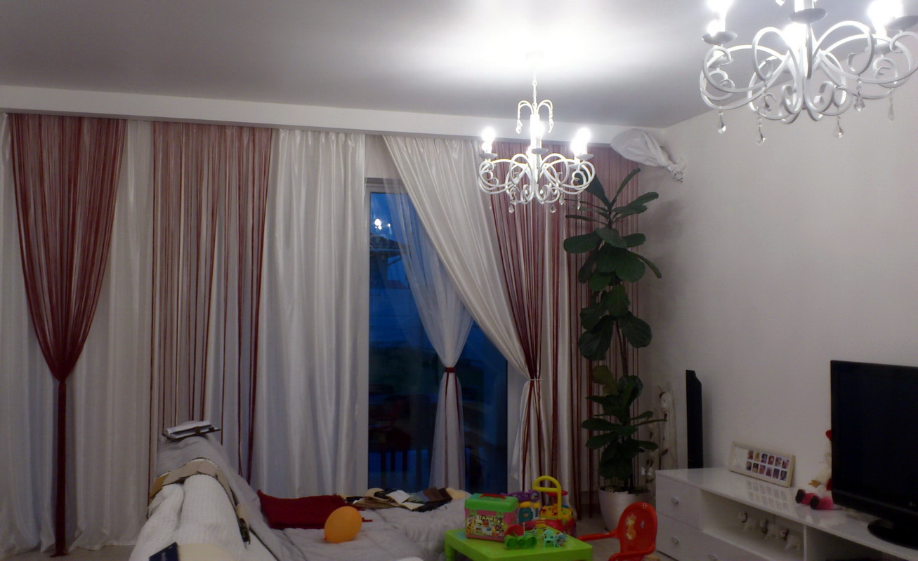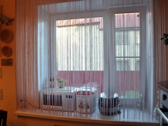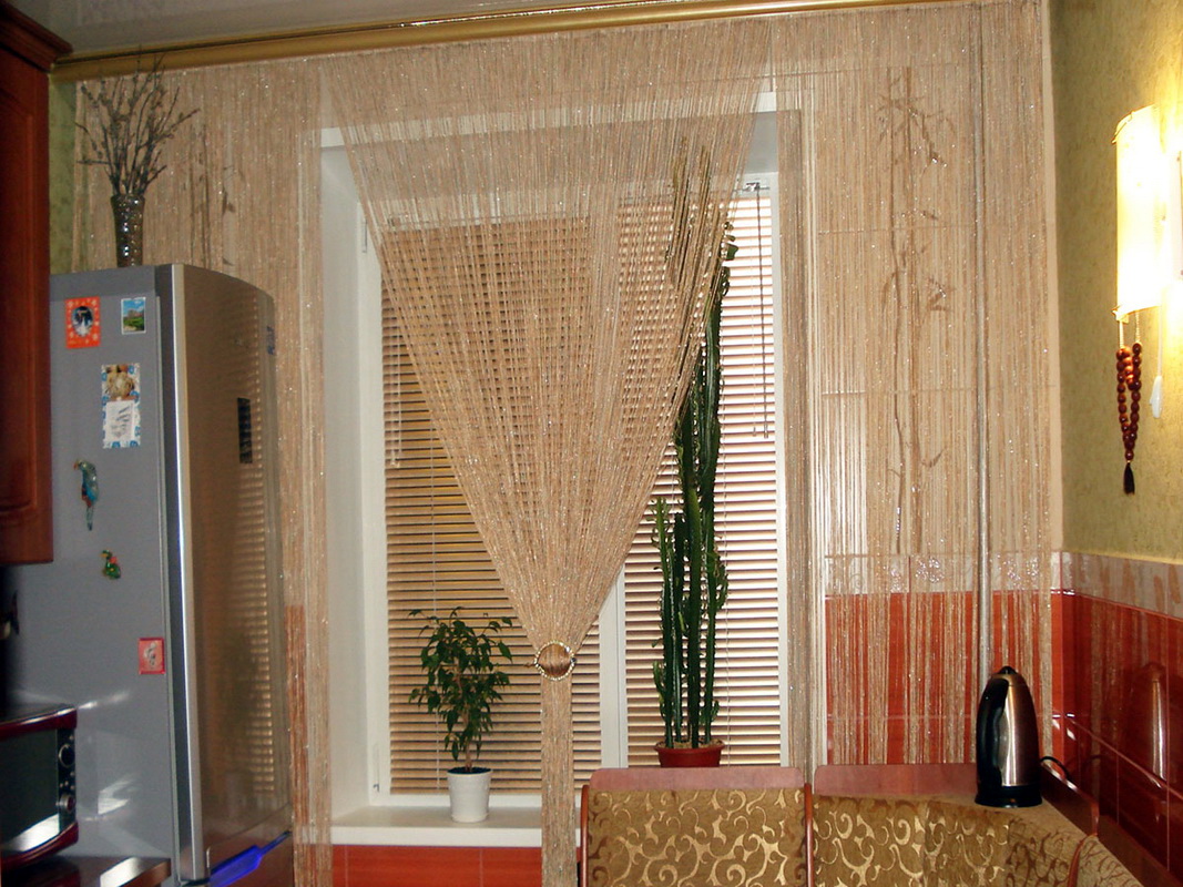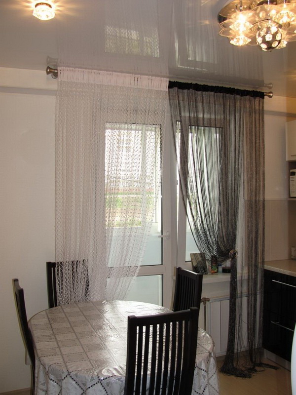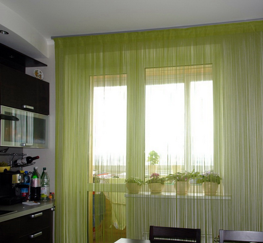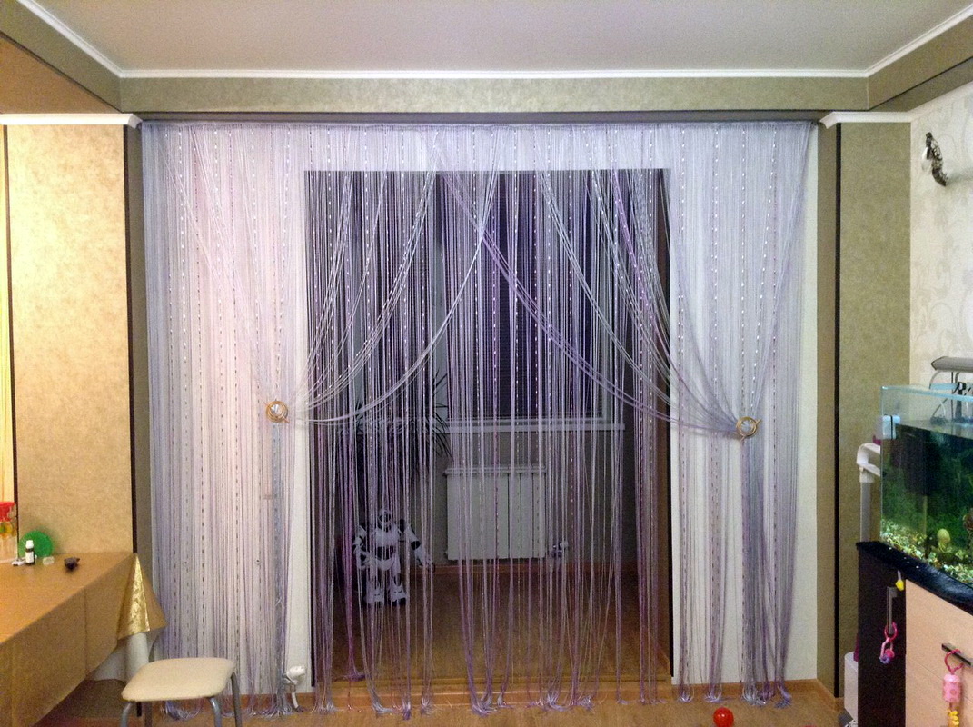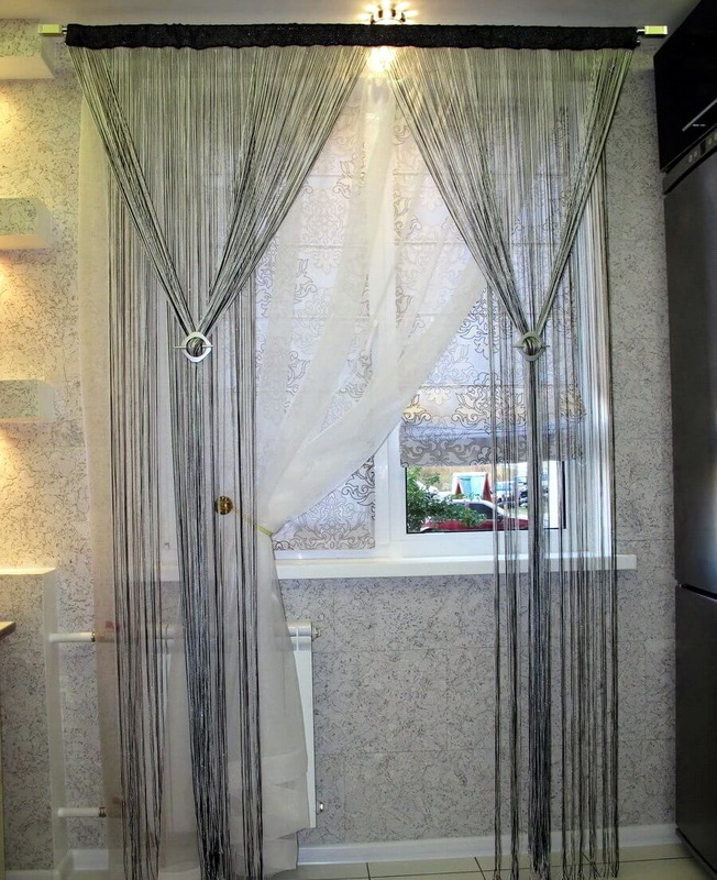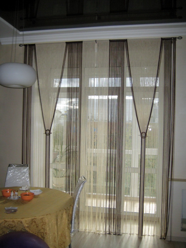 Un facteur important est l’objet de la pièce dans laquelle l’emplacement des rideaux de filament est prévu. Pour la cuisine sont parfaits rideaux courts en fil. Ils peuvent être combinés avec du tulle ou utilisés seuls.Dans le salon, vous trouverez souvent de longs rideaux de fil aux fenêtres. Elles donnent une touche de lumière à l’intérieur et se combinent parfaitement avec une salle pour l’accueil d’un cercle restreint d’amis ou une salle pour une grande entreprise.