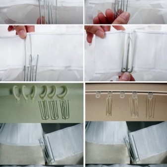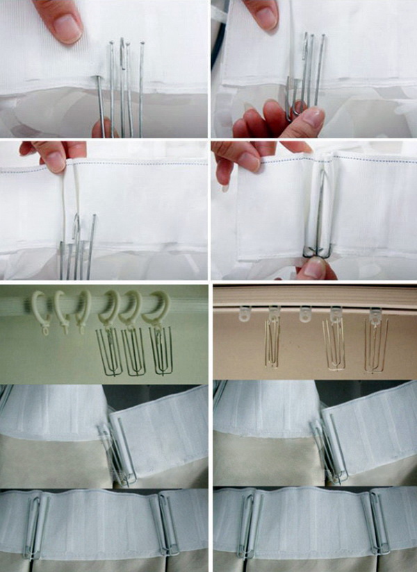 - Les rideaux peuvent être attachés aux anneaux avec des crochets. Ils sont insérés dans un ruban spécial cousu à la partie supérieure de la mousseline, puis attaché aux anneaux.