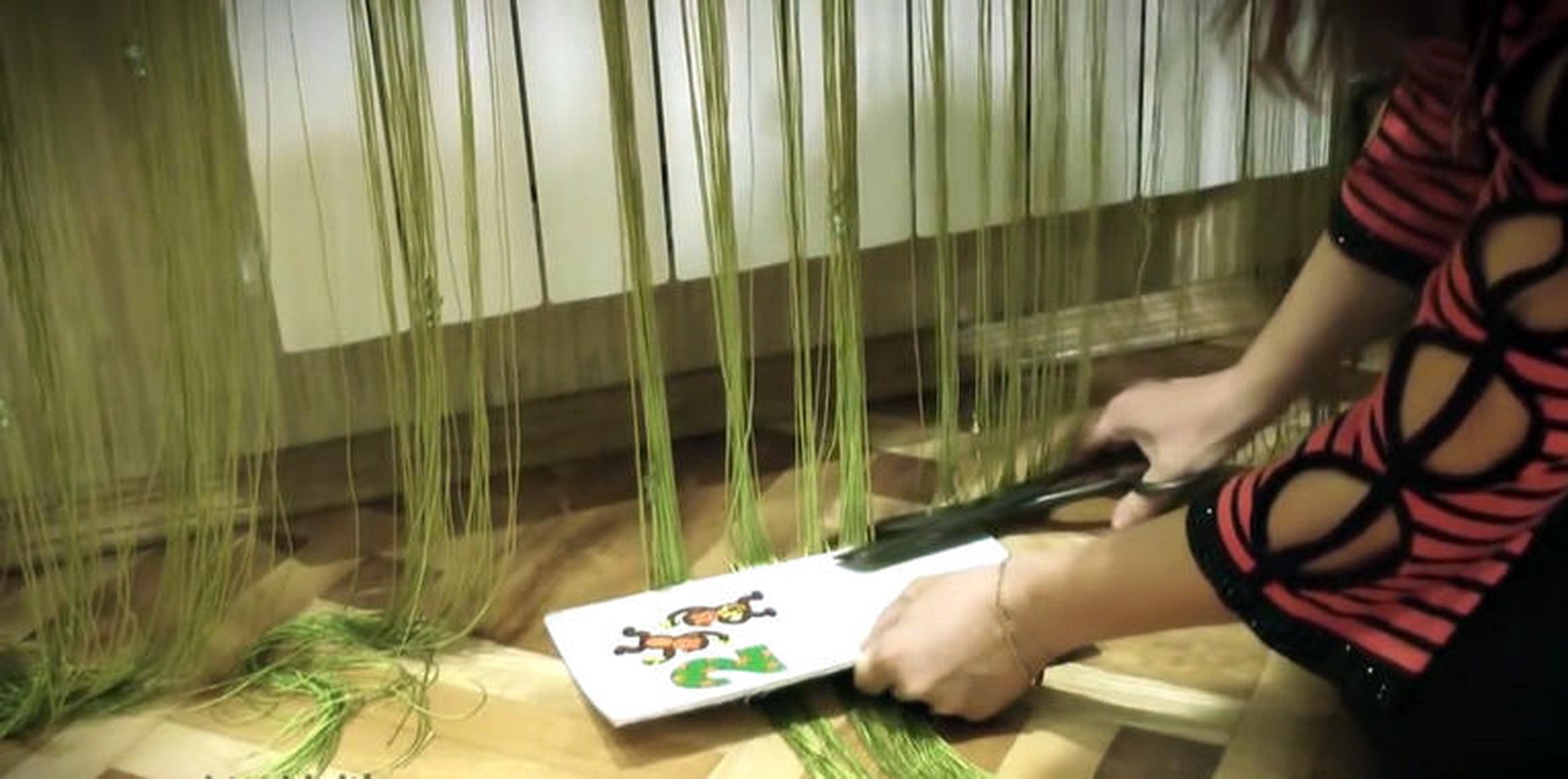 - Méthode technique implique l'utilisation d'outils de couture pour changer la longueur du fil. Couper la partie supplémentaire des rideaux ne fonctionnera pas exactement si vous mettez le produit à l'horizontale. Par conséquent, sans retirer le rideau des avant-toits, coupez-le avec des ciseaux, en utilisant une feuille de papier ou un livre pour maintenir le niveau. Ne pas ottyagirovat chaque fil, avant de le raccourcir.