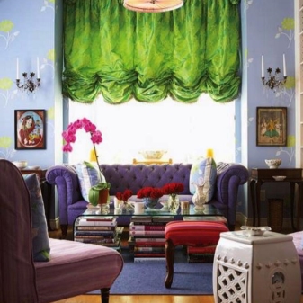 Les rideaux d'olive et même une palette pourpre feront l'affaire. Il est important de se rappeler: si la pièce est petite, le motif sur les rideaux doit être petit, et, au contraire, dans une grande pièce, il vaut la peine d'utiliser des rideaux avec un grand motif.