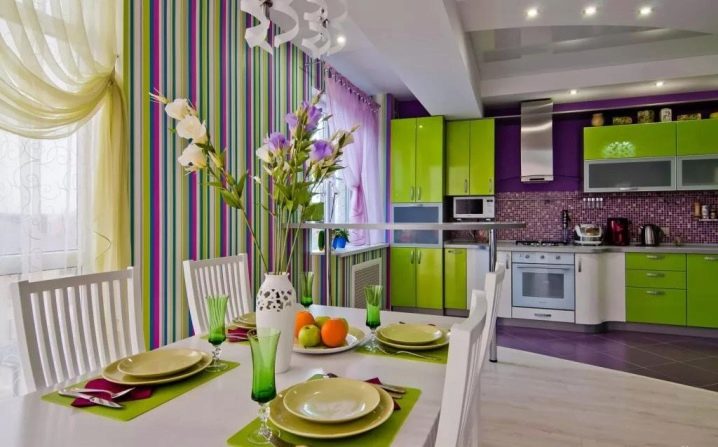 - Souvent dans la cuisine définir un coin de cuisine lumineux, qui sur un fond de murs violets devient un point culminant. Pour compléter l'harmonie du décor et équilibrer les couleurs, vous pouvez décorer les fenêtres avec des rideaux lumineux de couleur beige, vert pâle.Non recommandé dans les rideaux de la cuisine massive.