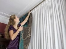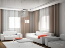 - rideaux simples sans fioritures. Finition minimale. Les avant-toits doivent être de pleine longueur et fixés au plafond ou au sommet du mur.Cela va visuellement soulever le plafond, avec les rideaux visuellement, la pièce sera plus haute;