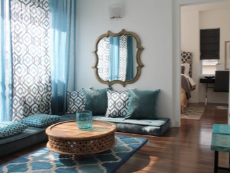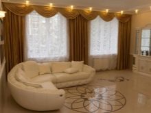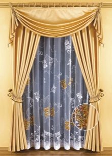 - Moderne - Rideaux asymétriques, tons sourds. Brillance, nacre, scintillement des fils, ainsi qu'un motif varié sont possibles. En tant qu'impression - ornement, fleurs, peau d'animal, concombre turc. L'emballage est combiné avec du textile monotone et de l'organza.