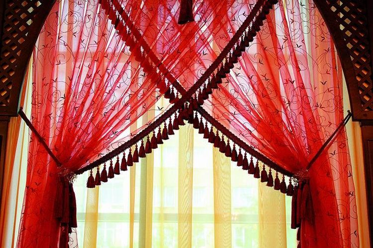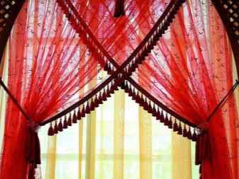 - rideaux en vitrail - pour leur confection, ils utilisent des tissus transparents (organza, tulle), noués au milieu, comme un sablier. Il peut être compris entre 3 et 5 barres verticalement;