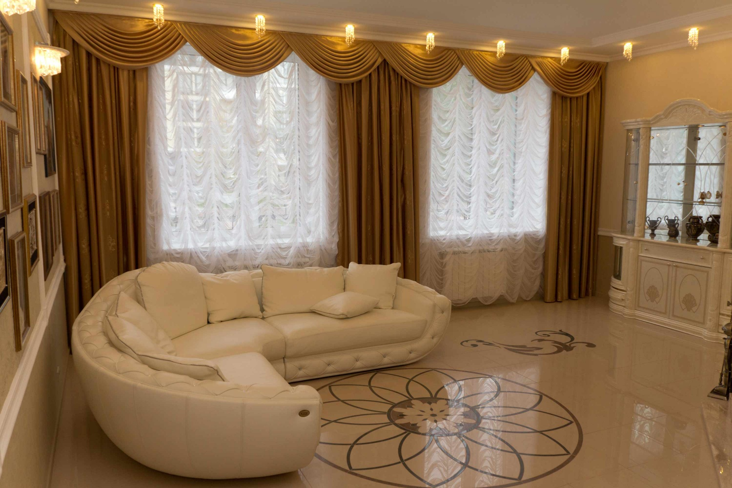 La pièce la plus importante de la maison est le salon, où ils passent du temps avec toute la famille, où les invités sont invités. Tout cela devrait se refléter dans un intérieur immaculé, car la pièce est toujours visible, contrairement aux autres pièces. Tous les composants de la conception, y compris les rideaux, doivent répondre à ces exigences. Le design des fenêtres est la touche finale dans la formation de l’image présentable de cette salle multifonctionnelle. Après tout, c’est aux fenêtres et à leur conception que la vue de toutes les pièces tombe.