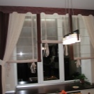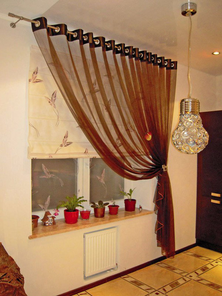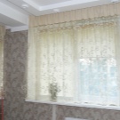 - Cuisine Ici, il est nécessaire de donner la préférence aux stores en bambou. Aussi rideaux pertinents de ce type de matériaux artificiels. Ceci est dû au fait que dans une telle pièce, de l'huile ou un autre polluant peut facilement tomber sur les rideaux, ils devront être lavés souvent et les tissus naturels ne toléreront pas de telles manipulations. Les rideaux de tulle ici peuvent être à la fois courts et au sol. Cela dépend de l'emplacement des meubles. Ainsi, si le rebord de la fenêtre est occupé par une table, seuls les rideaux courts fonctionneront; si la fenêtre a un bloc de balcon, seul un tulle de longueur accrue convient à ce cas.