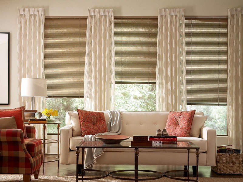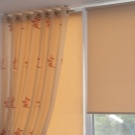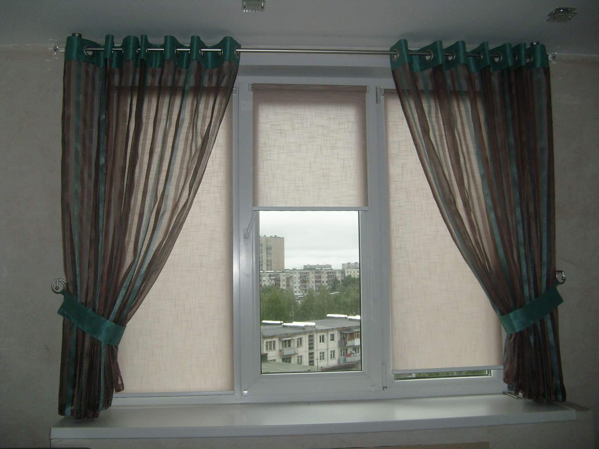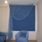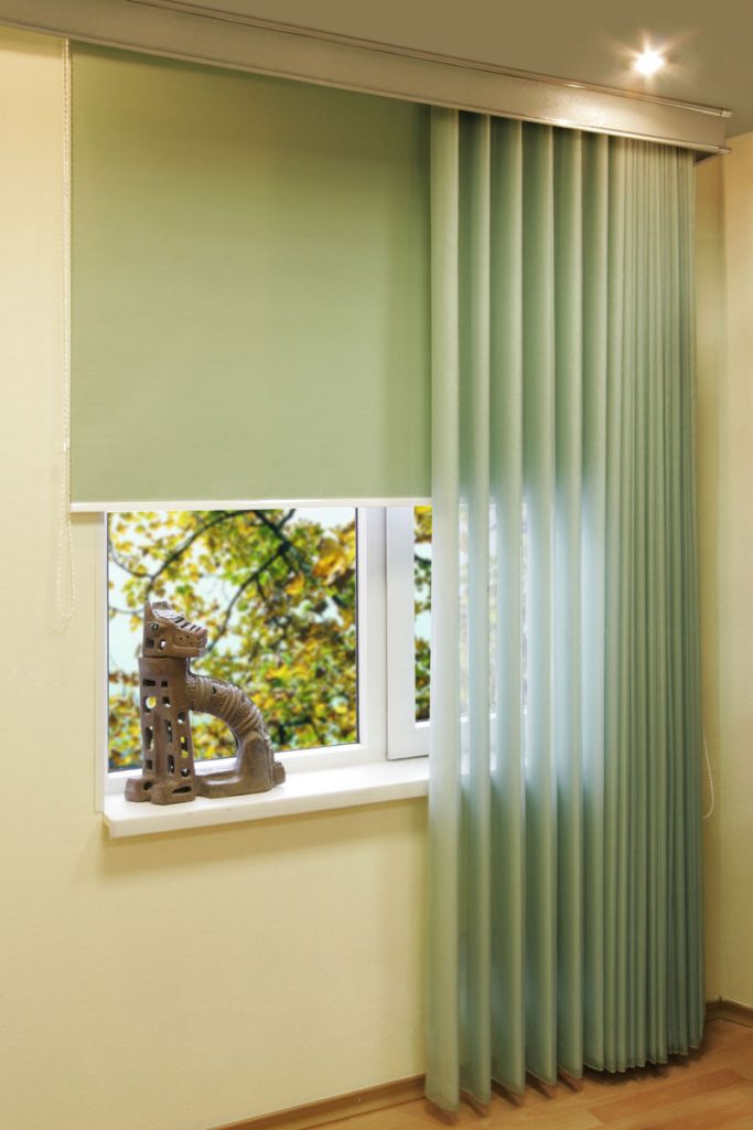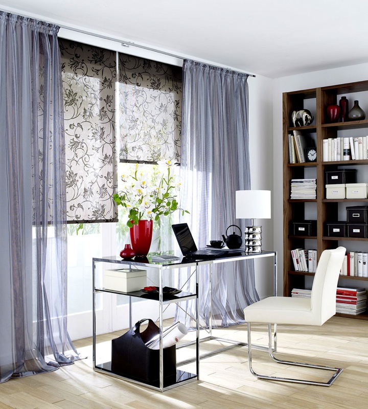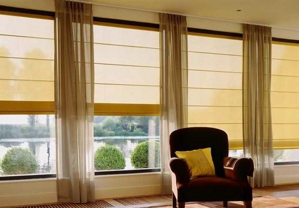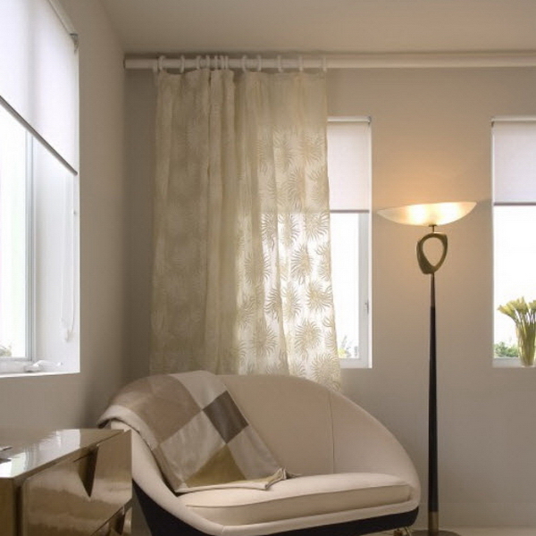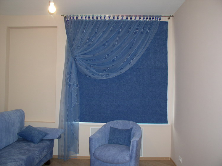 - Salle de séjour. Il est également possible de combiner ces deux types de rideaux.Dans le même temps, la teinte de la roleta ne devrait pas être très différente de celle du tulle et il est préférable de placer le voile ou l’organza comme cadre pour les volets roulants.