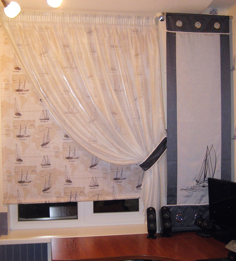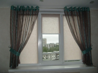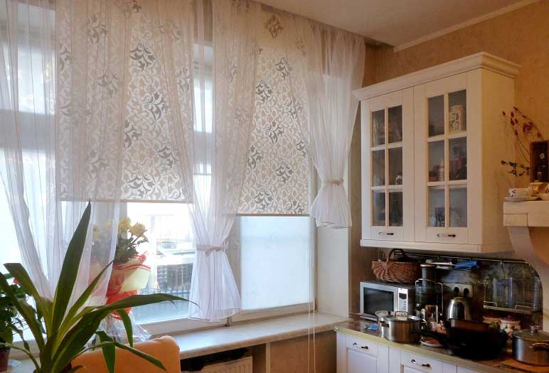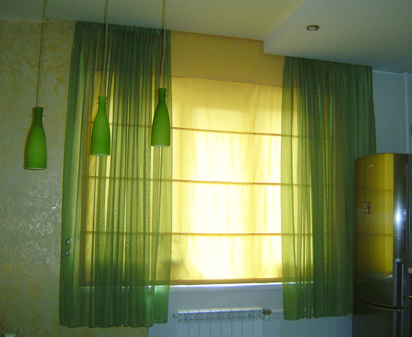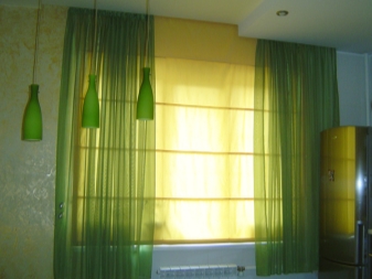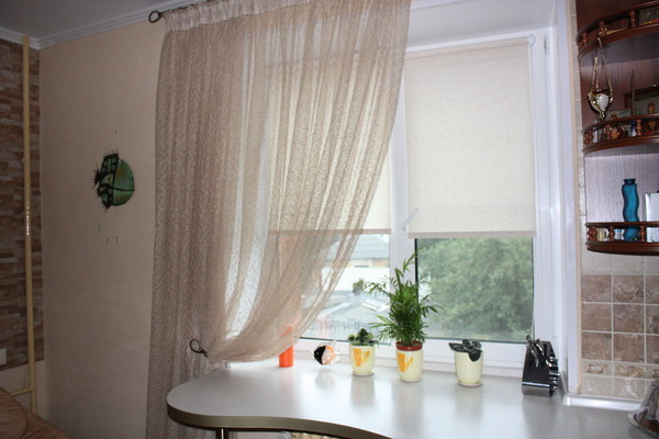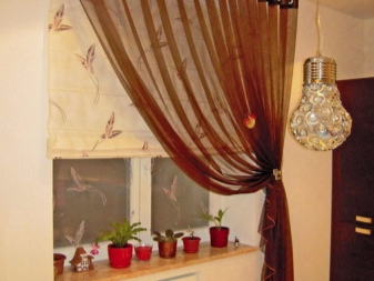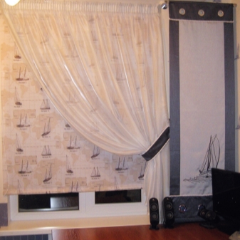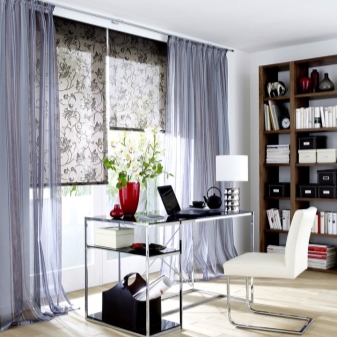 Voici quelques exemples à l’intérieur de la façon de combiner des volets roulants et du tulle. Dans la cuisine, un excellent choix serait des volets transparents, un voile sur le sol et des rideaux de coton d'un ton contrastant. Dans le salon, vous pouvez parfaitement appliquer des rideaux avec double rideaux de tulle. Dans ce cas, le tulle doit être terne et servir de rideau. Même en pépinière, cette combinaison est applicable. Il aura l'air bien rideau de tulle blanc et stores avec un motif fantaisie brillant. Les rideaux en tissu compagnon sont également appropriés.