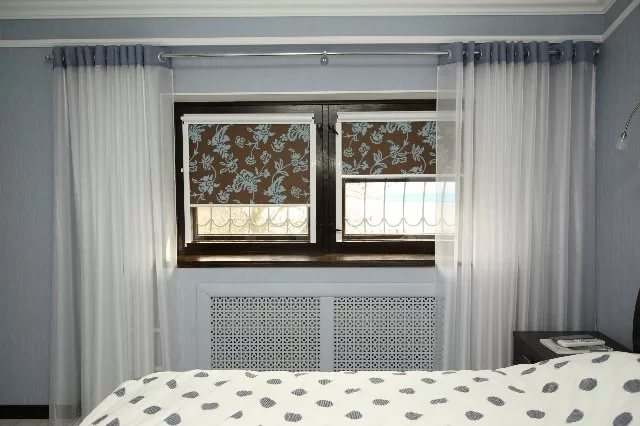 Il existe plusieurs types de décoration de fenêtre avec des volets roulants combinés avec du tulle: