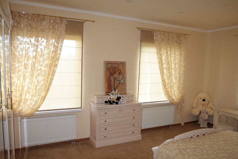En combinaison des volets roulants et du tulle, la principale caractéristique est que le tulle n’est pas conçu pour protéger la pièce du soleil. Sa fonction est d'adoucir les formes rigides de la roleta, ajoutant du confort et de la légèreté à l'intérieur. Les stores enrouleurs remplissent la fonction de rideaux épais. Ils protégeront la maison non seulement du soleil, mais aussi des regards indiscrets.