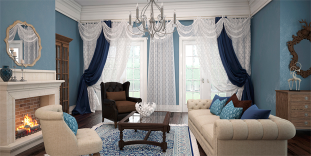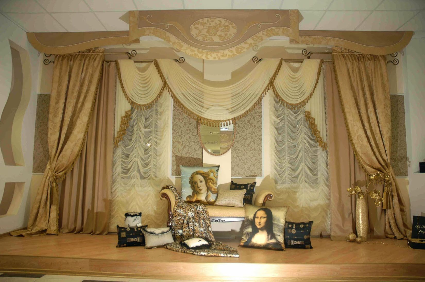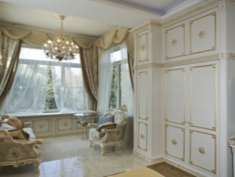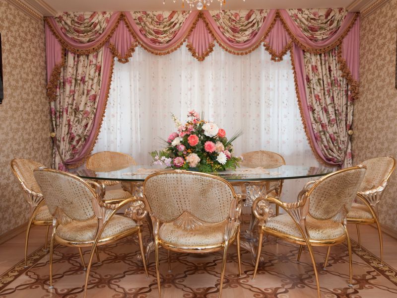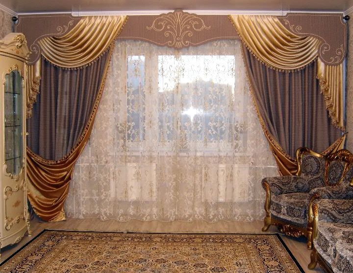 Pour le salon, de style baroque ou de l’Art déco théâtralisé, il est également préférable d’utiliser des lignes douces et élégantes, par exemple l’utilisation de swaggy sur une doublure.Dans la conception du salon, essayez de combiner le tissu, la décoration et la décoration. La meilleure option serait des tons profonds de violet, marron, or, vert, ils donneront à la pièce une lueur de pierres précieuses.