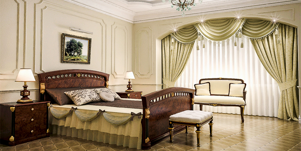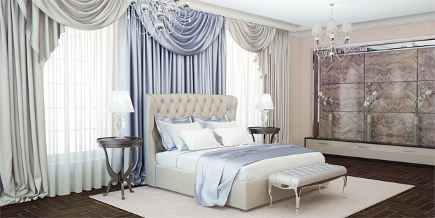 Une chambre à coucher dominée par les classiques aura l’air plus luxueux et élégant si vous utilisez non seulement des swags, mais aussi des cravates. Le tissage de tissus de couleurs variées donnera également à la pièce un aspect spectaculaire.
