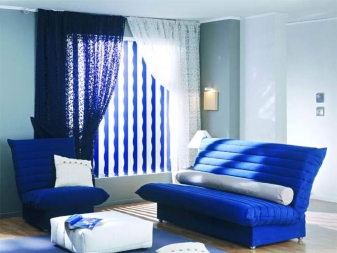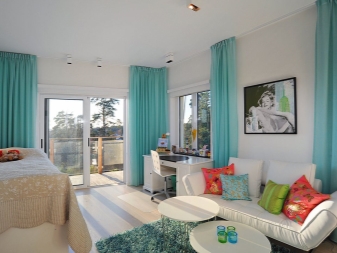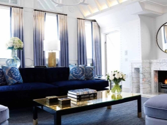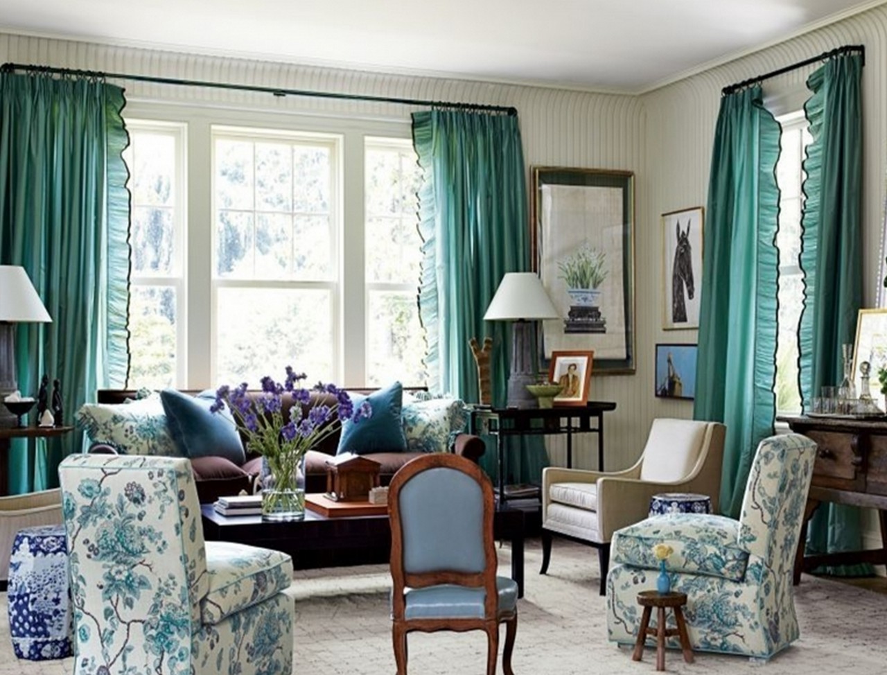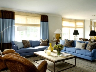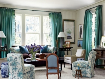 Les couleurs vives du spectre froid "effacent" visuellement les murs et augmentent sa taille, mais les couleurs sombres saturées, au contraire, le réduisent. Parce que si vous avez la possibilité d’augmenter légèrement le salon, il est préférable de relever les rideaux en bleu ou turquoise.