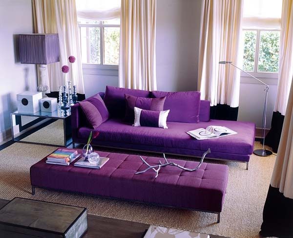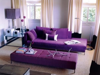 Une option exceptionnellement luxueuse pour ajouter des fenêtres - des rideaux violets. Cette couleur donne à la pièce un look noble, crée du confort. Il est très important de choisir de tels accessoires à l’intérieur pour les rideaux de couleur lilas qui harmoniseront et créeront une combinaison agréable pour les yeux.