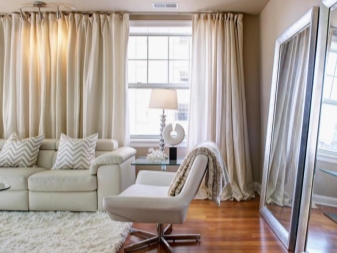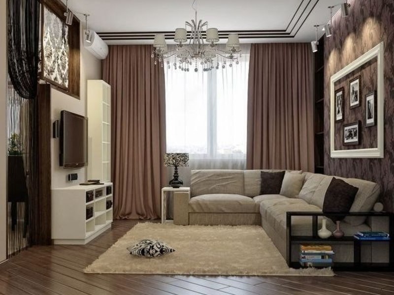 Si le salon n'est pas très grand, alors Avec l'aide de rideaux élégants, vous pouvez toujours faire plus visuellement. Pour ce faire, vous pouvez choisir des toiles monochromes de couleurs claires ou des rideaux finement imprimés.