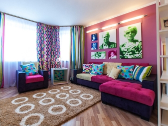 - Pop Art. Dans un salon ou une pièce conçu à l’origine, il vaut la peine d’utiliser des rideaux de couleurs vives ou même néon. Parfaitement en forme de produits d'organza. Vous pouvez combiner un certain nombre de bandes de tissu de couleurs contrastantes. Les rideaux avec une impression sont à la mode aujourd'hui.