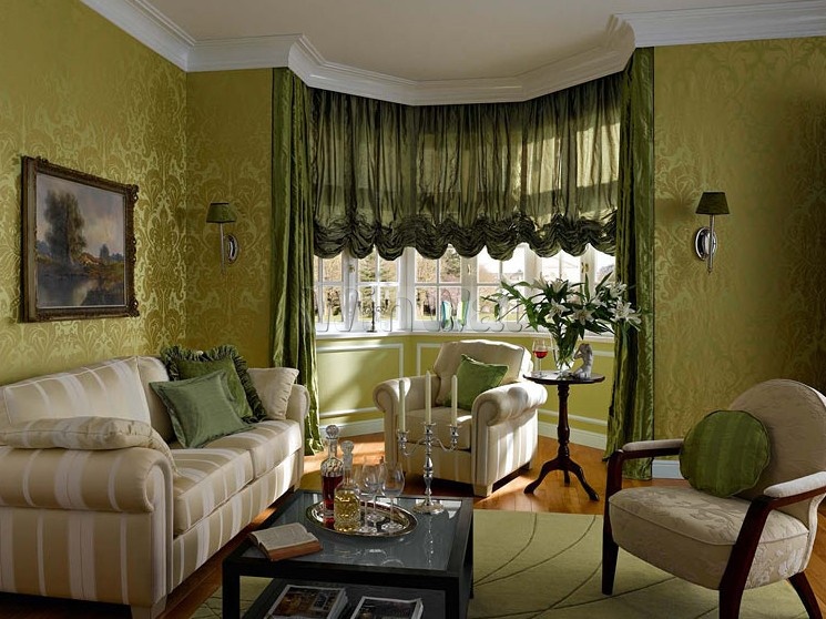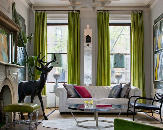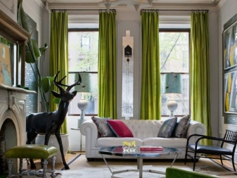 Les rideaux de couleur verte ont l'air juteux dans n'importe quel espace de vie. Les rideaux verts semblent très riches et sévères.