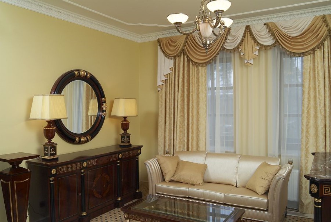- Empire Le tissu est acheté uniquement dans des couleurs claires. Dans ces intérieurs, la solennité est la bienvenue - on peut l’atteindre à l’aide de lourds et luxueux rideaux.