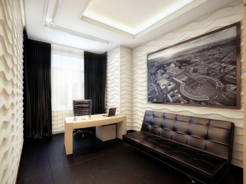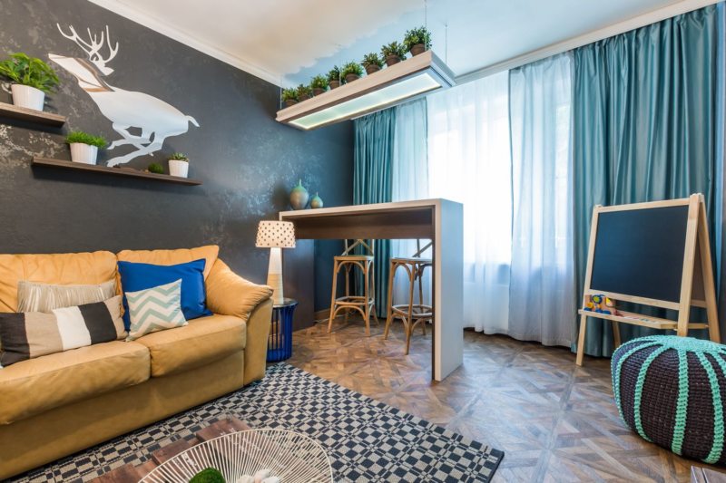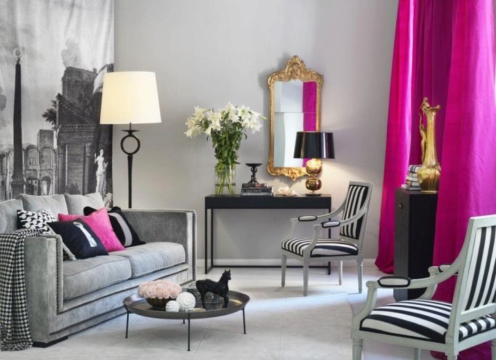 Les produits en noir et blanc peuvent constituer l’élément le plus frappant de l’intérieur, en contraste avec le ton habituel des murs et un canapé en cuir bleu-noir. Sous les revêtements muraux roses, vous pouvez choisir à la fois des rideaux gris de différentes nuances et des rideaux blancs et roses. Les couleurs calmes de pêche, bleu-laiteux et jaune conviennent à un coin doux violet ou lilas.