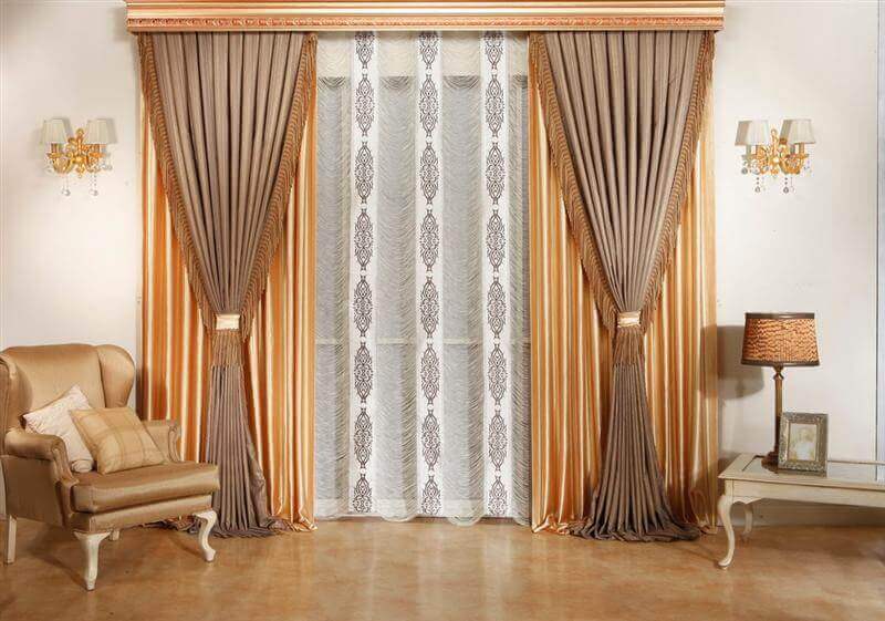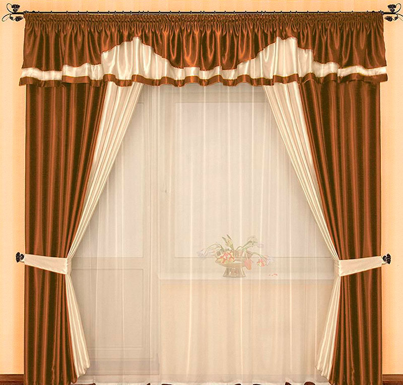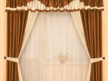 Habituellement, les rideaux de la tresse sont suspendus sur plusieurs rangées: tulle, rideaux, pelmetry. L'image montre l'une de ces options.