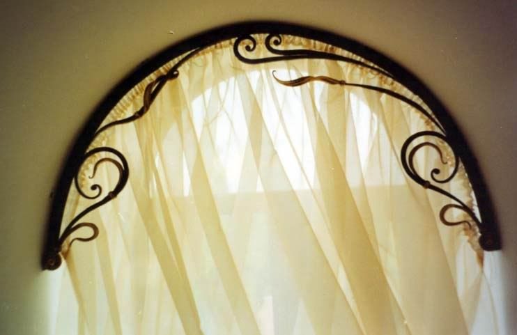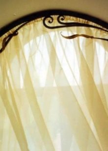 Pour la conception des ouvertures de fenêtres semi-circulaires utilisez non seulement des corniches cintrées. Les rideaux attachés à la corniche murale habituelle sont magnifiques. De plus, les avant-toits peuvent être installés au-dessus du bord incurvé et au-dessous.
