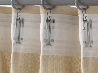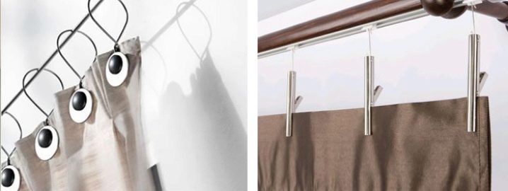 Comme d'habitude, les rideaux ont été attachés avec ce type d'attache. À ce jour, les pinces à linge et les pinces sont en métal et en plastique. Ils sont extrêmement gênants à utiliser car ils gâchent le tissu des rideaux et laissent des bouffées dessus. Pour un tissu fin, ce type de fixation ne convient pas catégoriquement, avec les alternatives existantes où il est plus logique de choisir des aimants en tant que fixation.