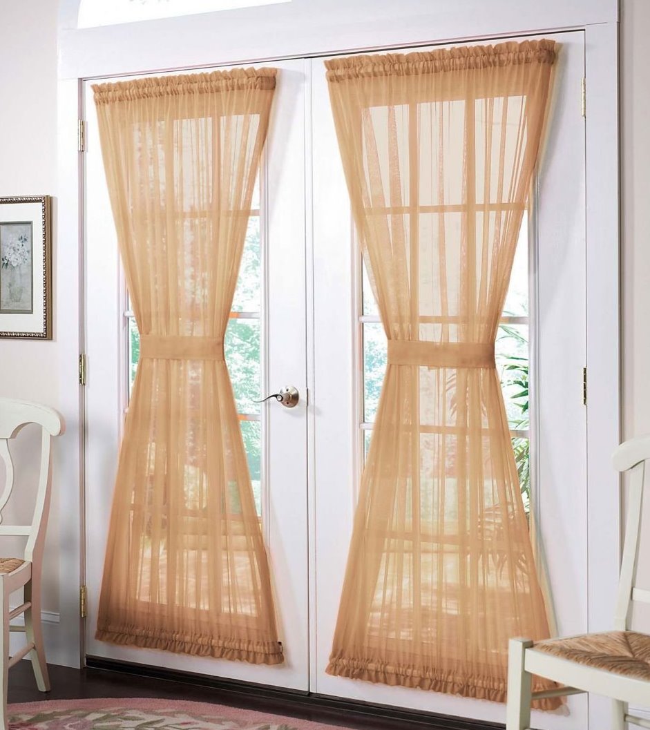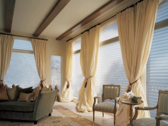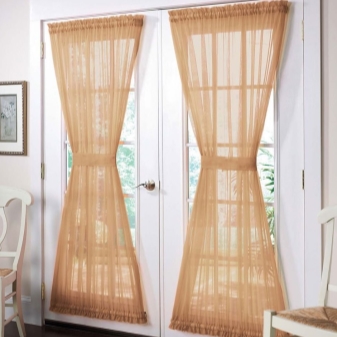 Maintenant très commun portes panoramiques. Si l'option avec les rideaux coulissants traditionnels ne vous convient pas, faites attention au tulle en sablier. Il convient aux fenêtres droites et inclinées.Avec l'aide de tulle, installé de manière similaire, vous pouvez décorer la porte, car il est monté directement sur la ceinture sur des corniches spéciales.