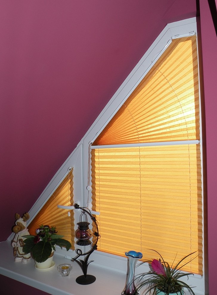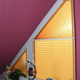 Fenêtres triangulaires sont généralement fabriqués à l'aide de stores "plisse". Ce type s’appelle ainsi car il s’agit d’une feuille de tissu spécialement traité, pressée sous la forme d’un accordéon. Les stores plissés peuvent être empilés sous n'importe quelle forme, y compris un ventilateur. Ils sont fixés avec du ruban adhésif double face.