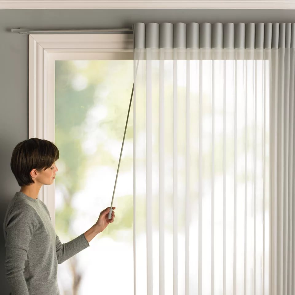 Lorsque vous encadrez des fenêtres considérablement plus hautes que la hauteur d’un homme, un pointeur sert à fixer les rideaux dans la conception des attaches. Avec son aide, vous pouvez facilement et facilement pousser ou tirer les rideaux sans tirer sur le tissu lui-même. Un tel appareil est très pratique. Le pointeur peut être facilement caché derrière le rideau et, si nécessaire, revenir.