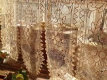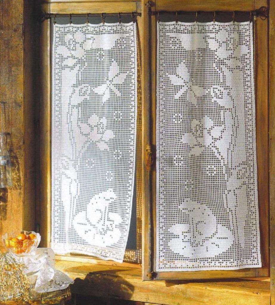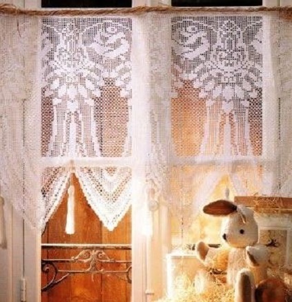 Les rideaux tricotés s'intègrent parfaitement au style intérieur de Chebbi-chic, Country, Provence, Scandinave et Russe. En fonction du style, des motifs sont sélectionnés sur la toile et, afin que les rideaux ne constituent pas l’accent central dans la pièce, une attention particulière est accordée aux accessoires supplémentaires - oreillers, serviettes, nappes connectées selon la même technique.