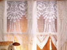 La technique du tricot (alternance de cellules vides et remplies) ne convient pas à toutes les pièces. Malgré le fait que cela vous permette de tricoter une toile avec absolument n'importe quel motif (même un tricoteur débutant sera capable de dessiner un motif en fonction des cellules), le rideau aura une orientation stylistique prononcée - style rustique. C’est-à-dire que les rideaux de cette technique conviennent à une cuisine romantique, une maison de campagne, un chalet. Une excellente option peut servir de rideau avec un filet comme un rideau entre deux pièces, ramassé par des pinces ou des supports.
