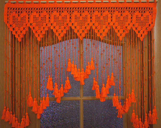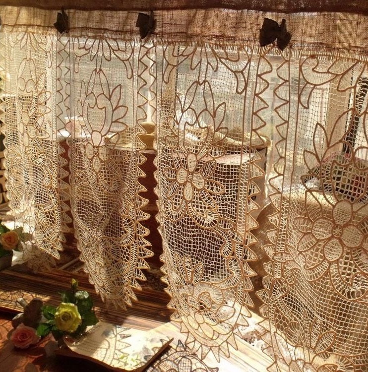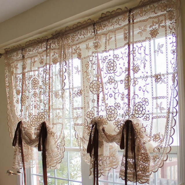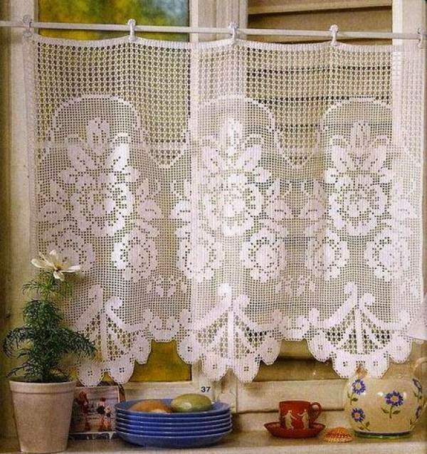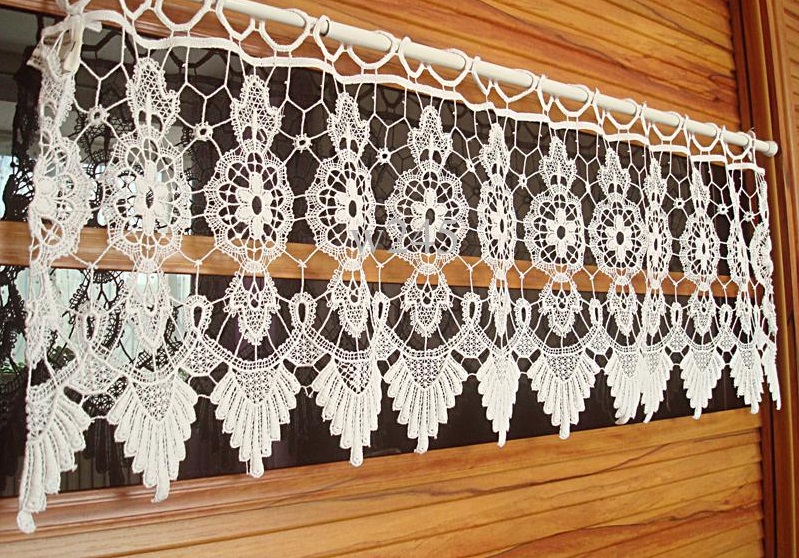 - Pour cuisine ou autres locaux non résidentiels Il vaut mieux choisir des rideaux courts. Ce choix est dicté plus par la praticité que par l’esthétique.Le rebord de la fenêtre est souvent utilisé comme espace de travail. Les longs rideaux ne feront qu’interférer. Cependant, il serait faux de penser que les rideaux ne peuvent être que droits ou avec un pompon à la fin. Les rideaux au crochet peuvent avoir des bords festonnés en forme de feuilles, de fleurs, de triangles, de dents en gradins. Si les rideaux ont un motif répétitif (rapport), alors les rideaux peuvent être assemblés sur les bords des supports.