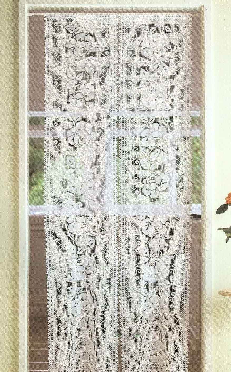 Les rideaux tricotés sont très souvent utilisés comme chevauchement visuel pour les portes intérieures en verre. Dans ce cas, chaque rideau s'adapte à la forme et à la taille du verre et est étiré sur le cadre à l'aide d'une ligne de pêche fixée dans le bourrelet horizontal supérieur et inférieur.