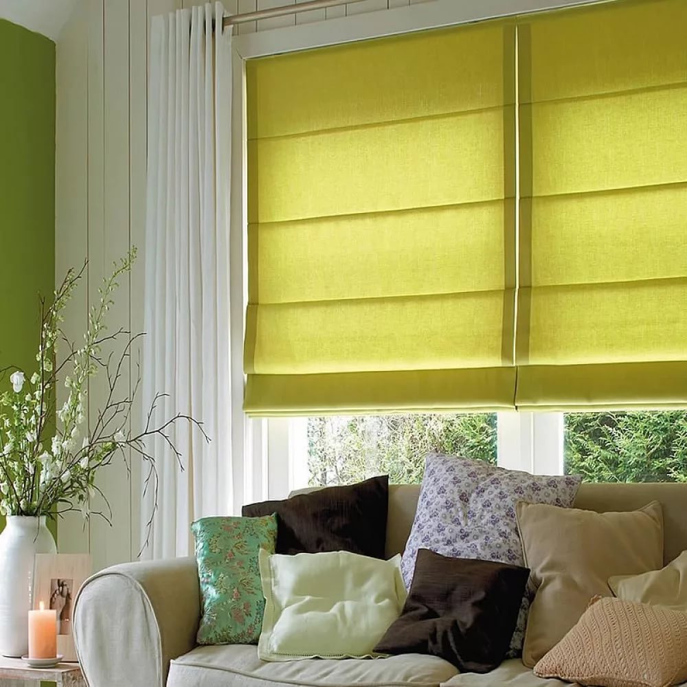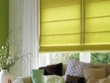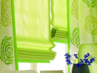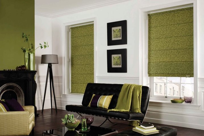 Dans une pièce aux plafonds bas, il est préférable de suspendre des rideaux verts lisses sans motifs. Vous devriez également faire sans fioritures et draperies. Idéalement, utilisez des stores ou des stores romains.