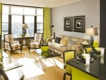 - Gris et vert - Une autre paire de couleurs classique. Ces nuances se complètent et sont belles et calmes ensemble. Ainsi, la pièce grise deviendra vivante si vous accrochez des rideaux brillants aux fenêtres. Le vert est combiné à d'autres couleurs: une nuance de menthe avec de l'or attire l'attention; combinaison rose et verte adaptée aux enfants; combinaison avec des tons rougescaractéristique des motifs ethniques.