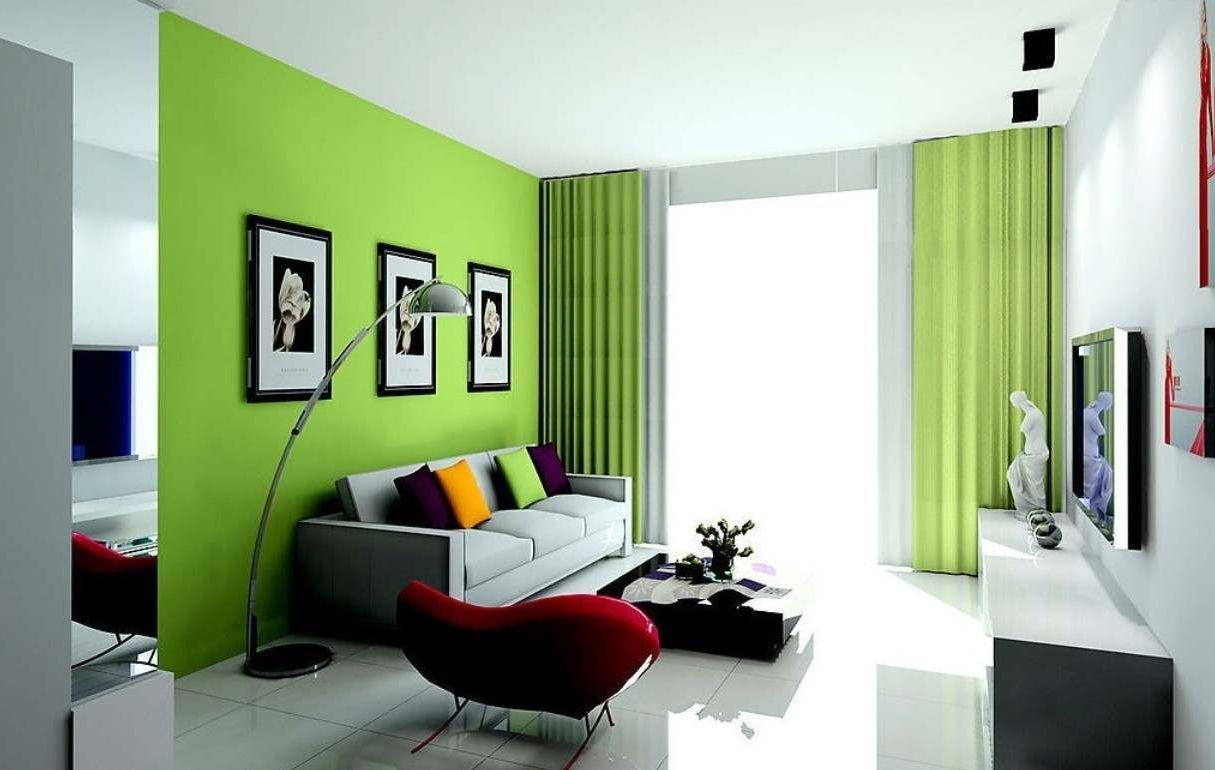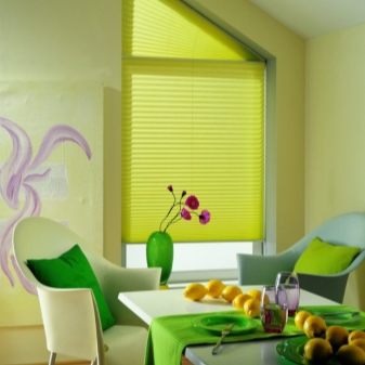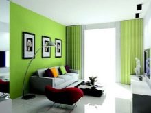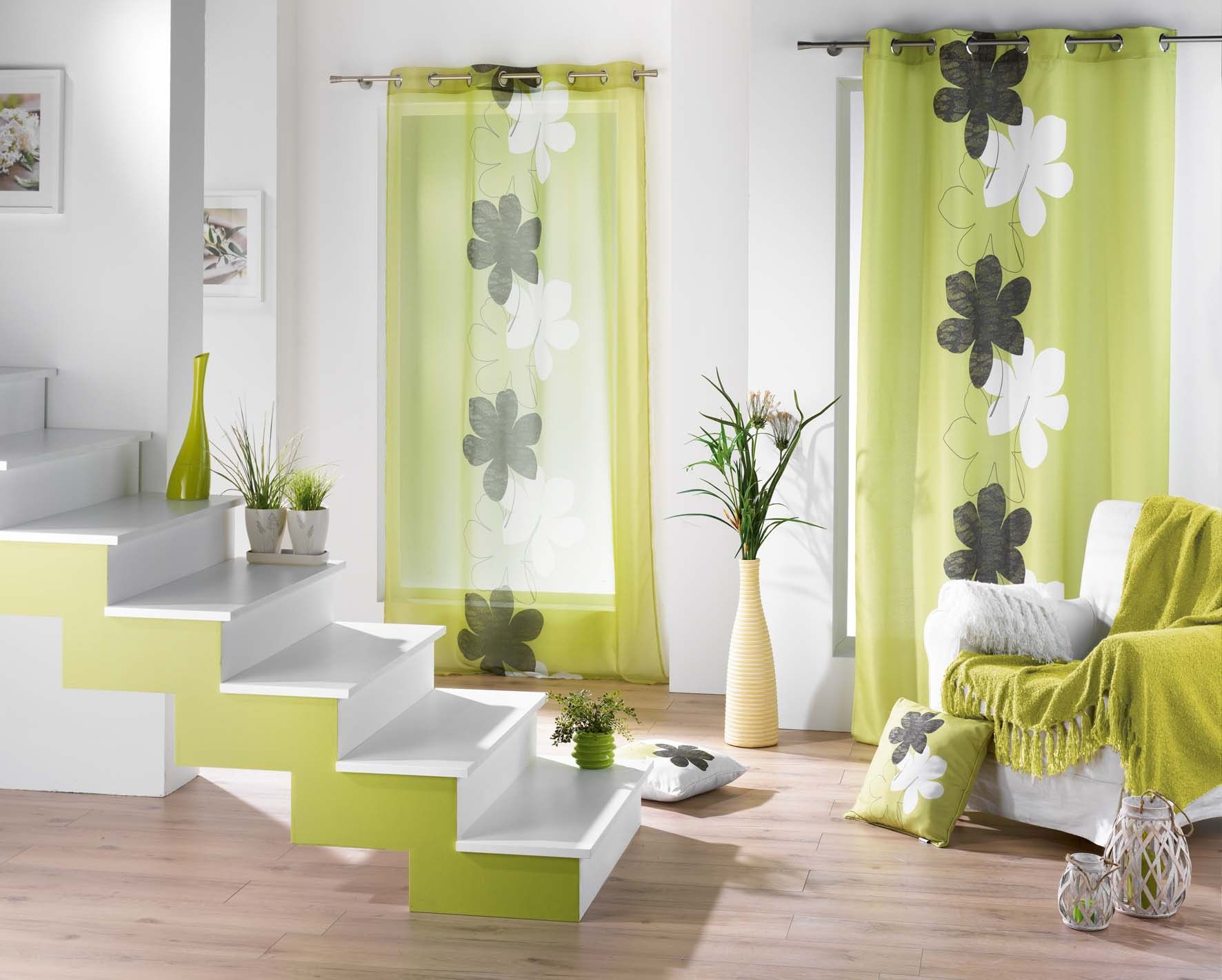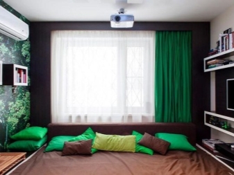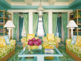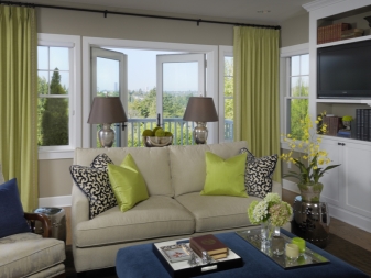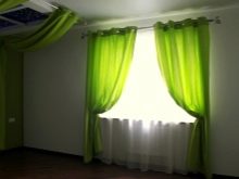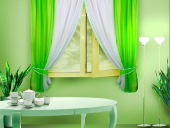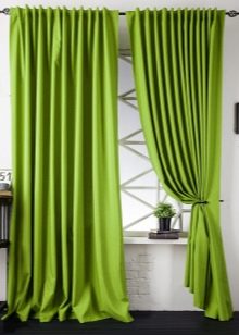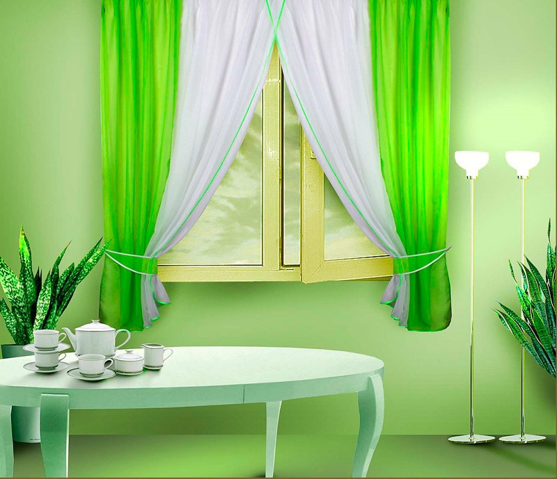 L'ombre vert clair améliore visuellement la pièce. La couleur de chaux extravagante, au contraire, est utilisée dans les grandes salles. La couleur verte, proche de la couleur jaune vif dans la palette conduit à l'action. Le ton bleu-vert des rideaux, au contraire, calme la psyché. Et les rideaux de couleur olive favorisent la concentration.